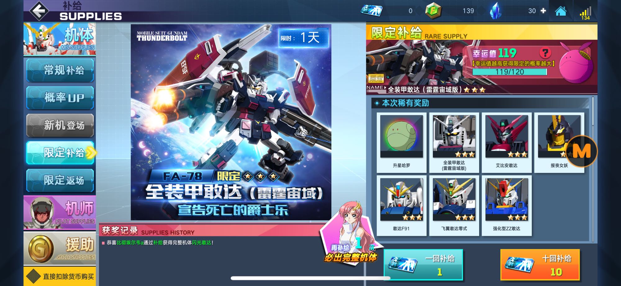 现在幸运值是119,下面也是在抽一次出整机。现在抽就能得这个全装高达吗?有没有必要留着等下次新限定?