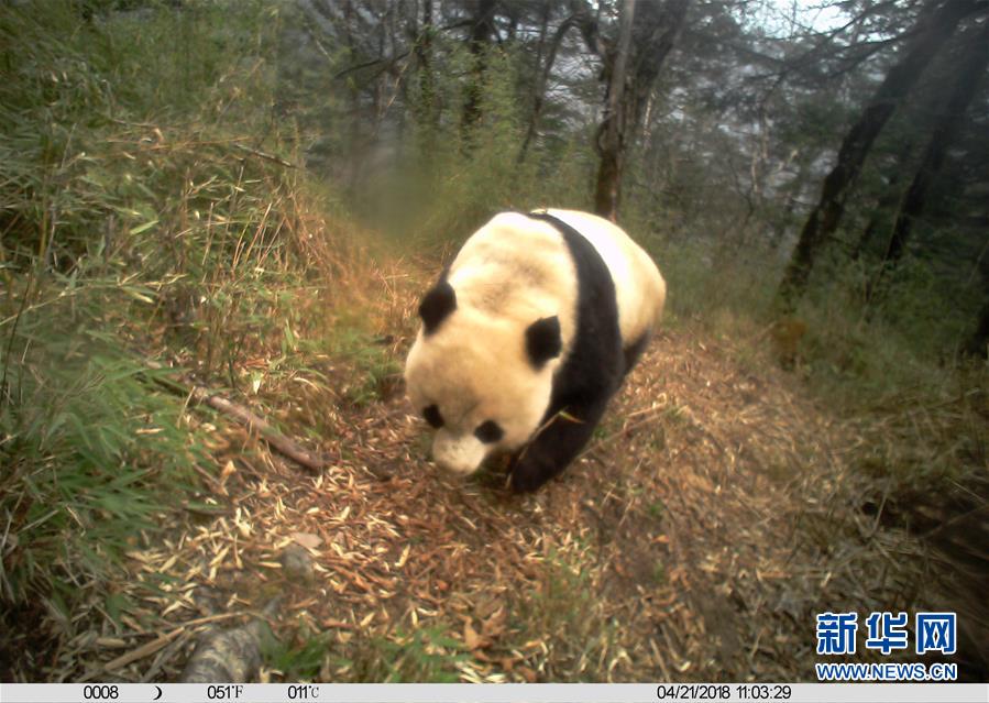 这是在甘肃白水江国家级自然保护区内布设的红外相机拍摄的野生大熊猫活动影像(3月24日摄)。新华社发(甘肃白水江国家级自然保护区供图)
