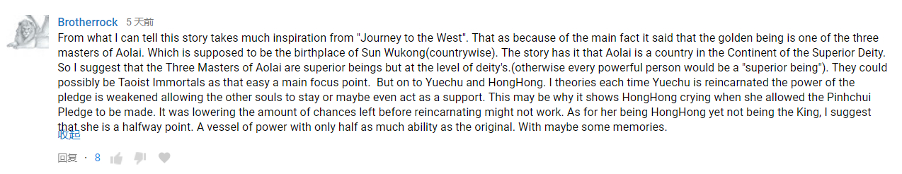 据我所知,这个故事从《西游记》中得到了很多启示。根据剧情,它说小金人是傲来的三个大师之一。这应该是孙武空的出生地(乡下)。这是神之大陆的一个国家。所以我觉得傲来的三位大师是优越的存在,但在神的范畴内(否则,每个有权势的人都会是一个“优越的存在”)。他们可能是道教神仙。但对月初和红红来说,我的理论是,每当月初转世时,誓言的力量被削弱,允许其他灵魂留下或甚至充当支持。这也许就是为什么当红红允许平丘誓言时,她在哭【嗯?红红哭了吗?】。它降低了在转世之前的可能性。至于她是红红,但又说不是涂山之王,我觉得是一半一半。有原红红的一半能力,也许还有一些回忆。