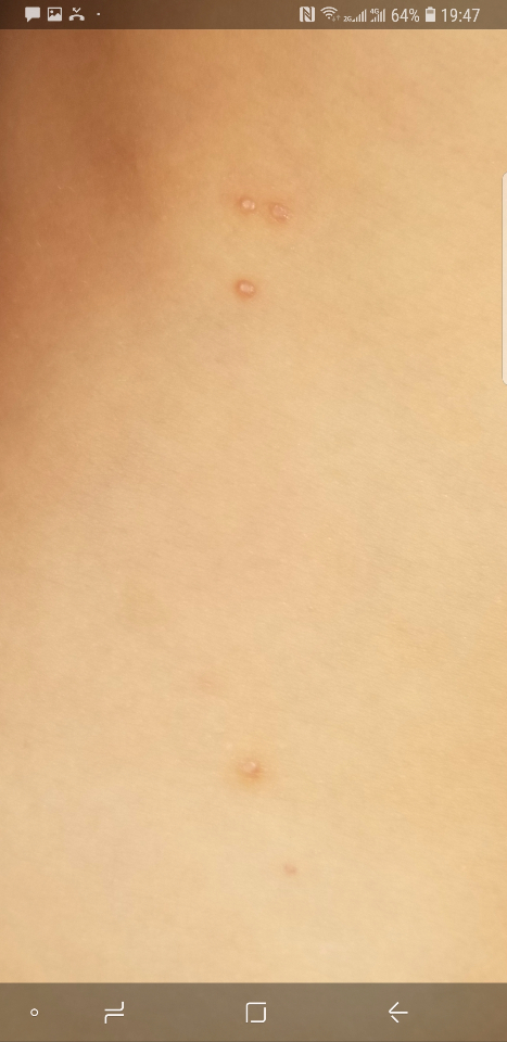 我家小朋友4岁8个月,突然右边腰上长了几个小点点。后来到华西温江分院一检查,说是传染性软疣。让我们去华西夹掉。开了外用麻醉药和手术费,三天之内去交费,然后做个庖液抽取术。也就是这样,到处看帖子,说夹子夹掉小朋友好受罪啥的。纠结了一晚上。也看了协和医院皮肤科医生的贴子说这个能自己好。我就完全放弃去医院受罪了。每天洗澡后就抹点碘酒,皮肤都抹厚了一层。有些小点点,不知道是不是。一抹就没了。所以在这俩个月之内。软疣只增加了2个。还有一个小包包那天红肿了,我手快,一拉拉掉了里面的白色小点点。出血了,然后我用碘酒止血按压。「网络上有个宝妈说了,这血有毒」把碘酒押进皮肤里测底杀死病毒。这是今天的照片,下面这一颗已经快好了。上面还有一颗已经红肿,等着它成熟。孩子也不受罪。就是这样,耐心等待。对了一定要加强营养。这是现在的照片,已经平了。没有白色凹顶了。