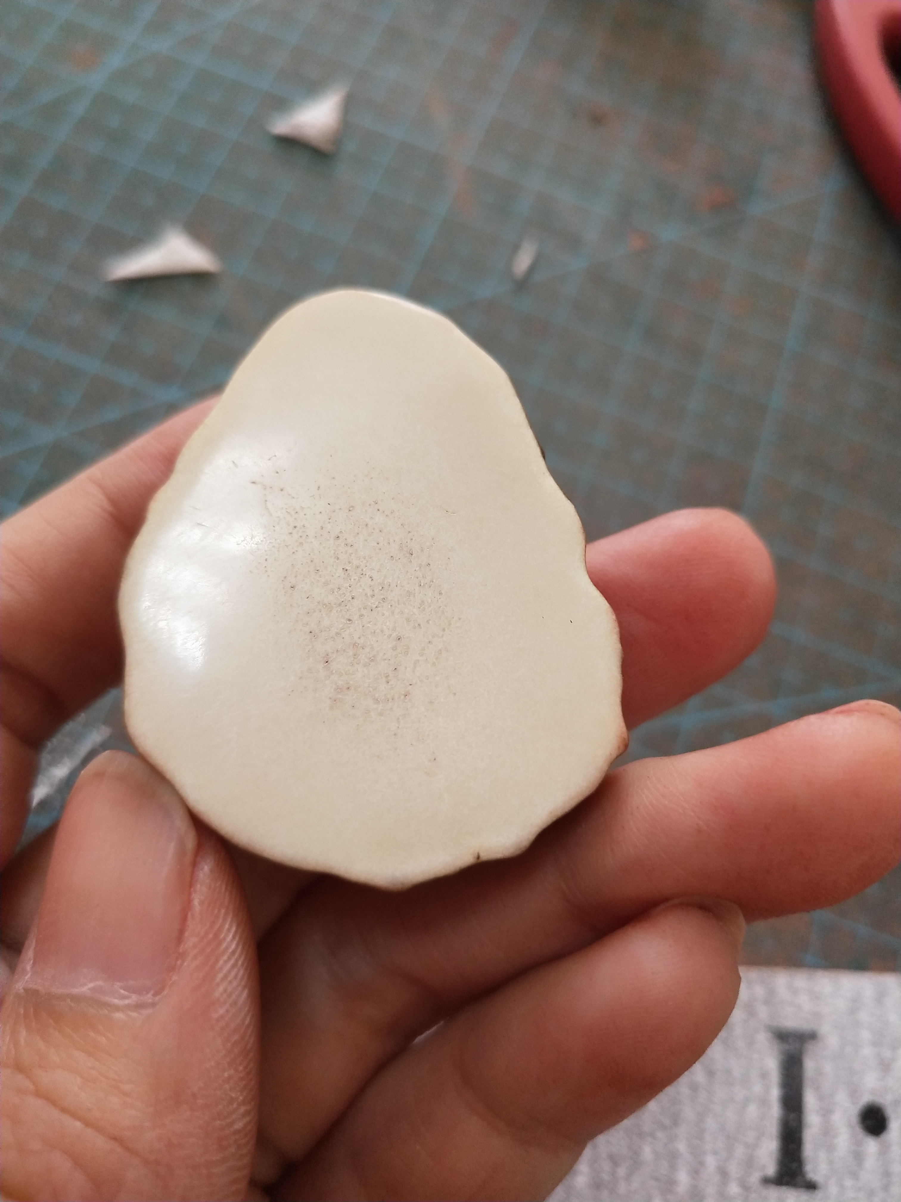 先把两面磨平,抛光,磨到光滑就可以了。鹿角本身中间有气孔结构,所以没办法磨到完全镜面,这个只能接受事实了。中间看到的小黑点是气孔,不是脏,照片比较明显,其实肉眼看还好啦。