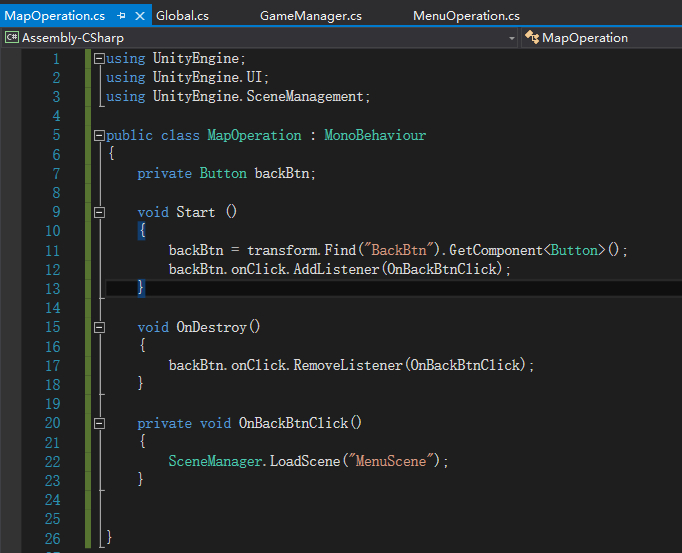 6.在MapScene场景, 创建MapOperation.cs, 把它绑定在Canvas上, 编辑脚本, 点击返回按钮到菜单界面