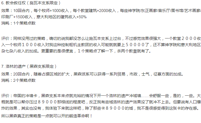 以下部分仅仅包含了天主家系&国教的策略,以及各个策略的效果,花费,和我使用以后的感受,其中效果我直接从日志中进行了引用。但不包括获取策略点数的部分,这个部分我会在接下来的开局思路、天主家系、帝国国教部分进行说明。