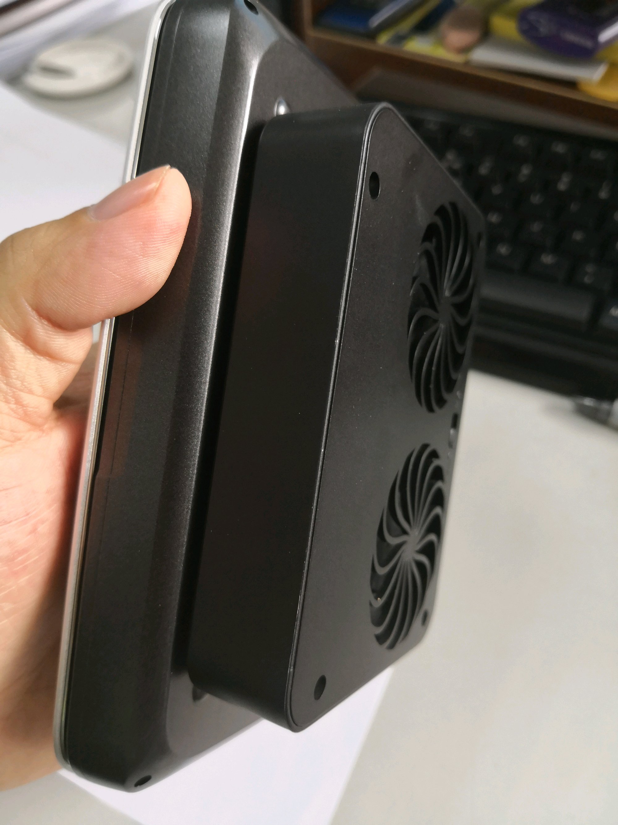 机器没到前就就买了,为了满足尺寸要求把机器和风扇都用纸做成平面图,两个风扇正好对机器风扇和ssd,之前担心吸盘对不上,没想到今天到货一式,完美,正好让开四个脚点,吸的很结实,拿的手里完全没问题,放在桌上也可以,很轻,上图。总结一下,在外观上完美搭配,效果不知道怎么样