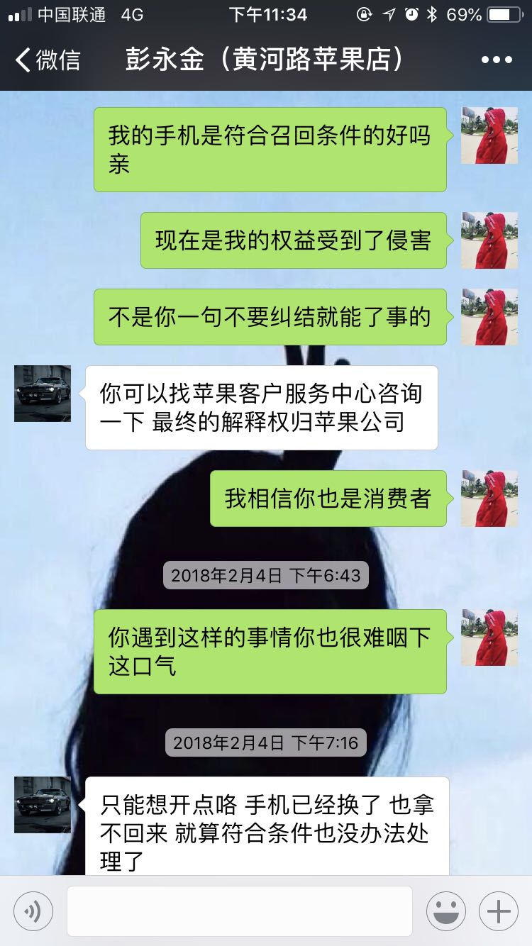 1月初的时候手机因为时不时没有信号就拿去苹果店准备维修,工作人员说我的手机因为基点消失(苹果召回原因),要拿回厂家维修一星期,费用大概修2000左右,我想着维修不一定适用长久,就又补钱重新买了一个苹果7,看到官网在召回,我就找到苹果实体店销售(卖手机给我的销售)咨询解决办法,得出的结果是让我想开点