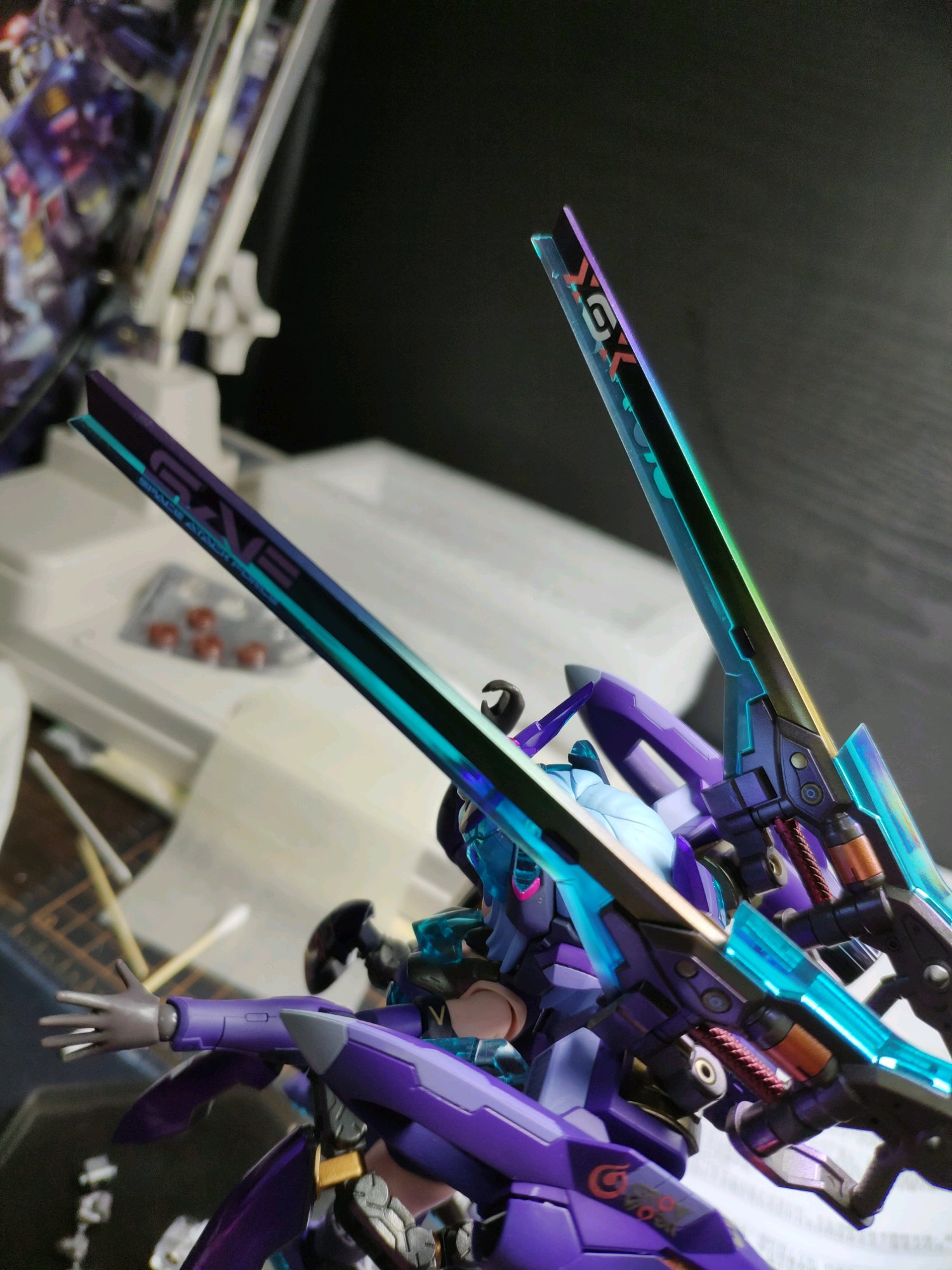 头发 窝改的 2333配色 用的是匠狱的荧光蓝差盖亚亮光白 配主色调 韩后荧光蓝做发烧的渐变 最后紫色点缀一下再盖一层 主色 滤镜 降低对比度更加和谐