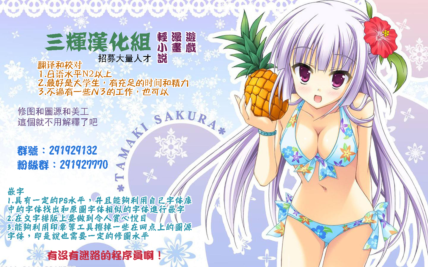 游戏快好了,欢迎各位粉丝进群了解情况,为翻译们打打气当拉拉队之类的。群号就之前发帖的那个招翻译的。贰玖咿旧散耳已霸气。这个图是另外一边汉化组帮忙宣传招人的,和天使的游戏没关系。