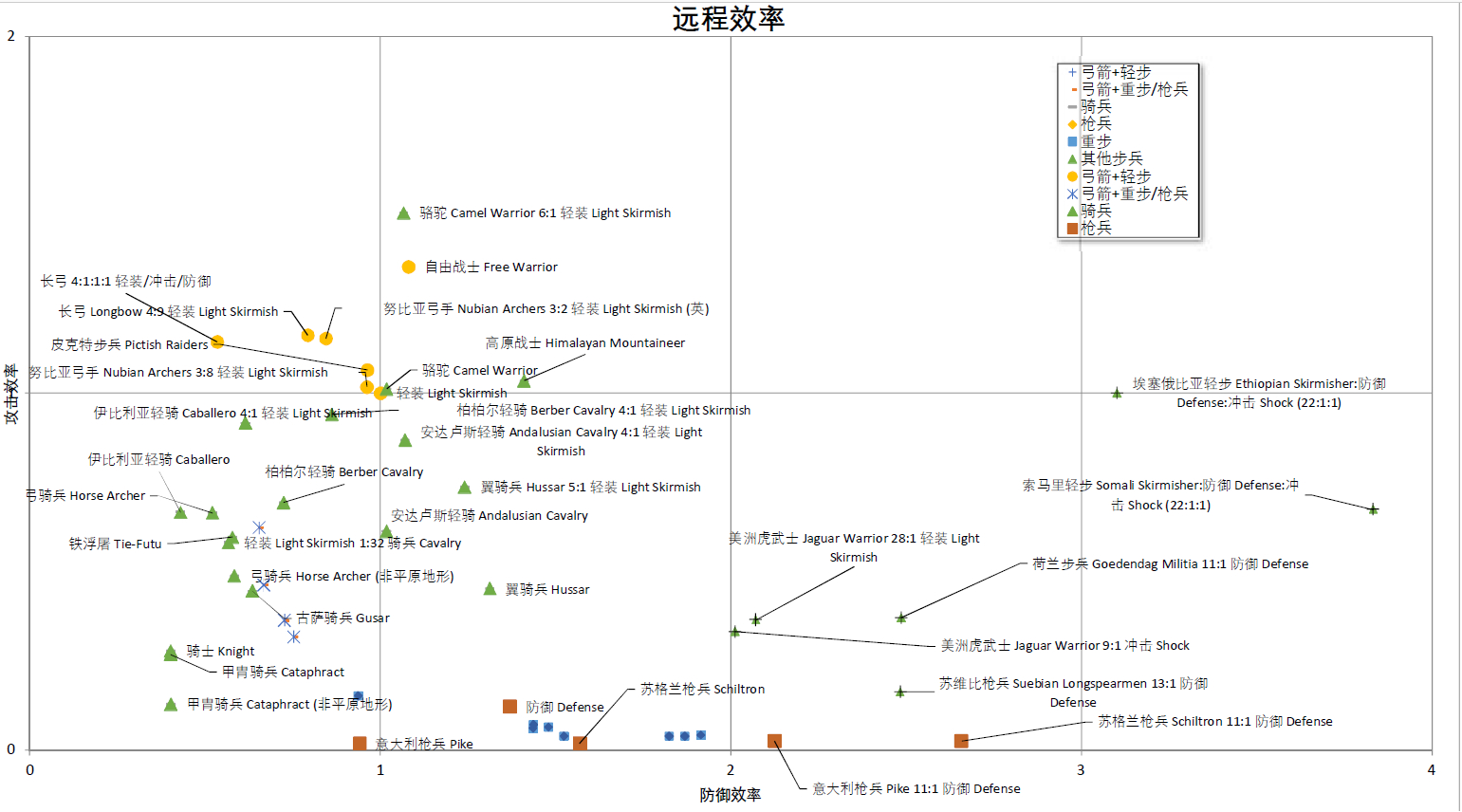 4. 整体来讲,近战阶段按绝对能力排名和除以人力、花费的排名差不多。远程阶段则不然,弓箭混轻步的流派在攻击效率(除以人力、花费后)方面很强,超过了各轻骑。