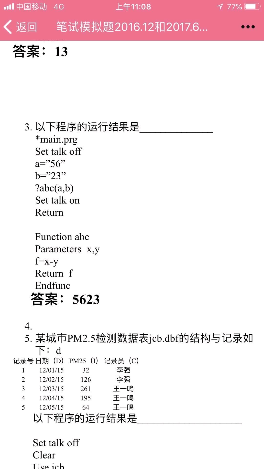 自定义函数abc(x,y)的作用是将两个参数作减运算,而主程序中的两个参数a,b的数据类型是字符型,字符型作减运算就是去空格连接,所以"56"-"23"="5623"