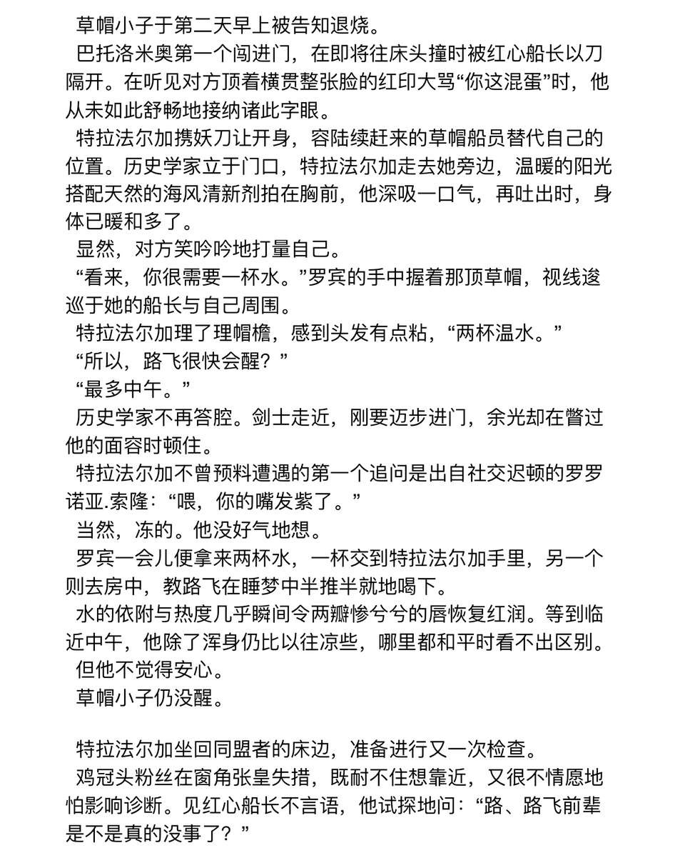 他需要医书。他需要与时间较劲,耗尽整个二十四小时、一千四百四十分、八万六千四百秒地翻阅一行一页。他不可以停止思考,思考佐乌的行程,思考曾经与草帽小子荒废的每时每刻——思考这个病。