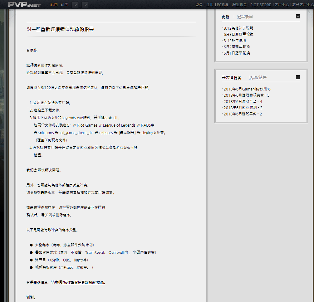 关于今早韩服更新后出现的问题