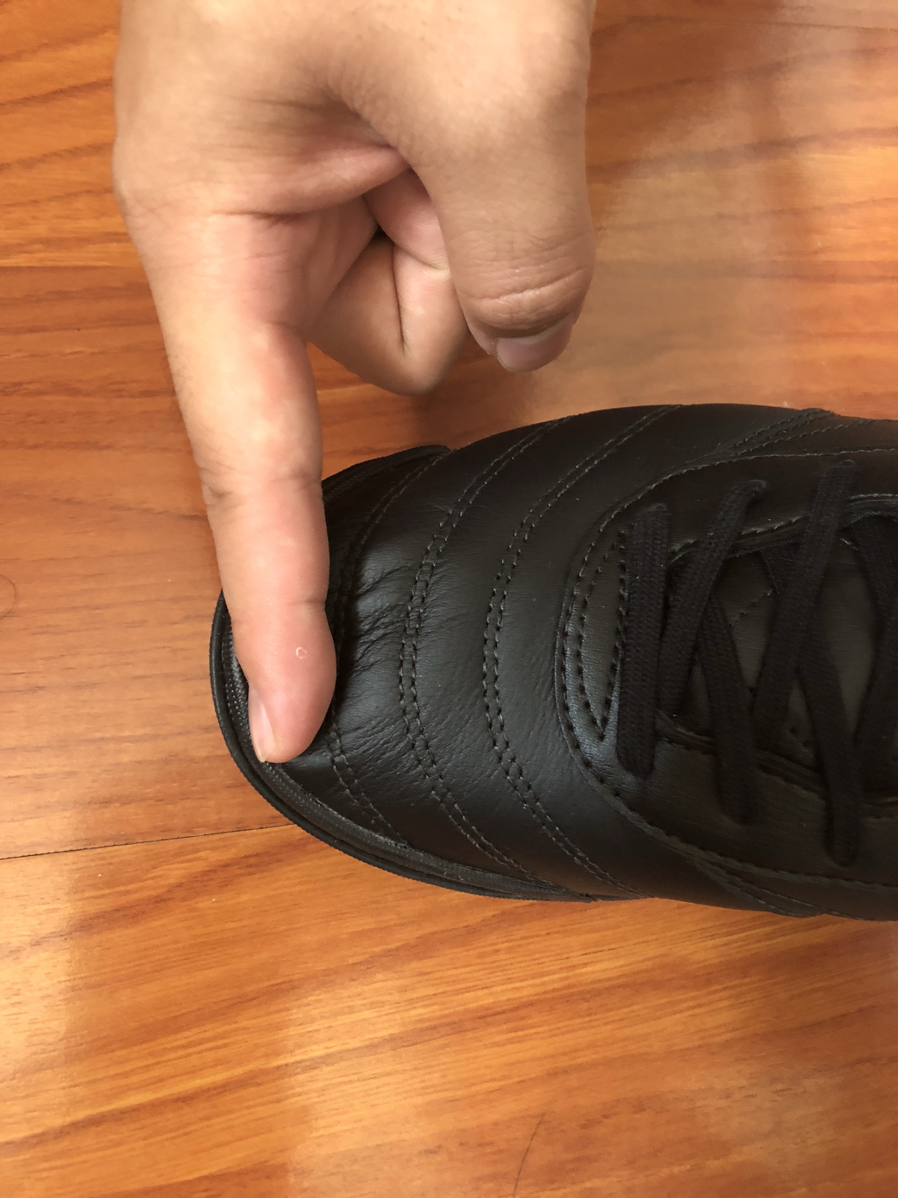 老哥们受累帮忙看下,一张图是正常穿上之后前面的量,食指指腹顶着右脚大拇指,另一张是脚使劲向前顶,食指可以不太费劲地插进去,请问需要换小一号吗,谢谢了