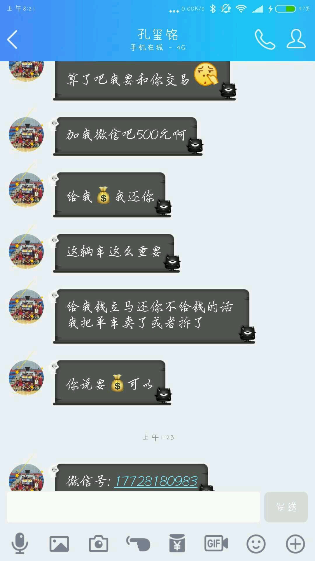 这边的老哥已经出动了,现在车拿回来了,准备教训一下那个初中鸡