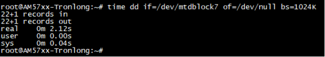 Target# time dd if=/dev/mtdblock7 of=/dev/nullbs=1024K