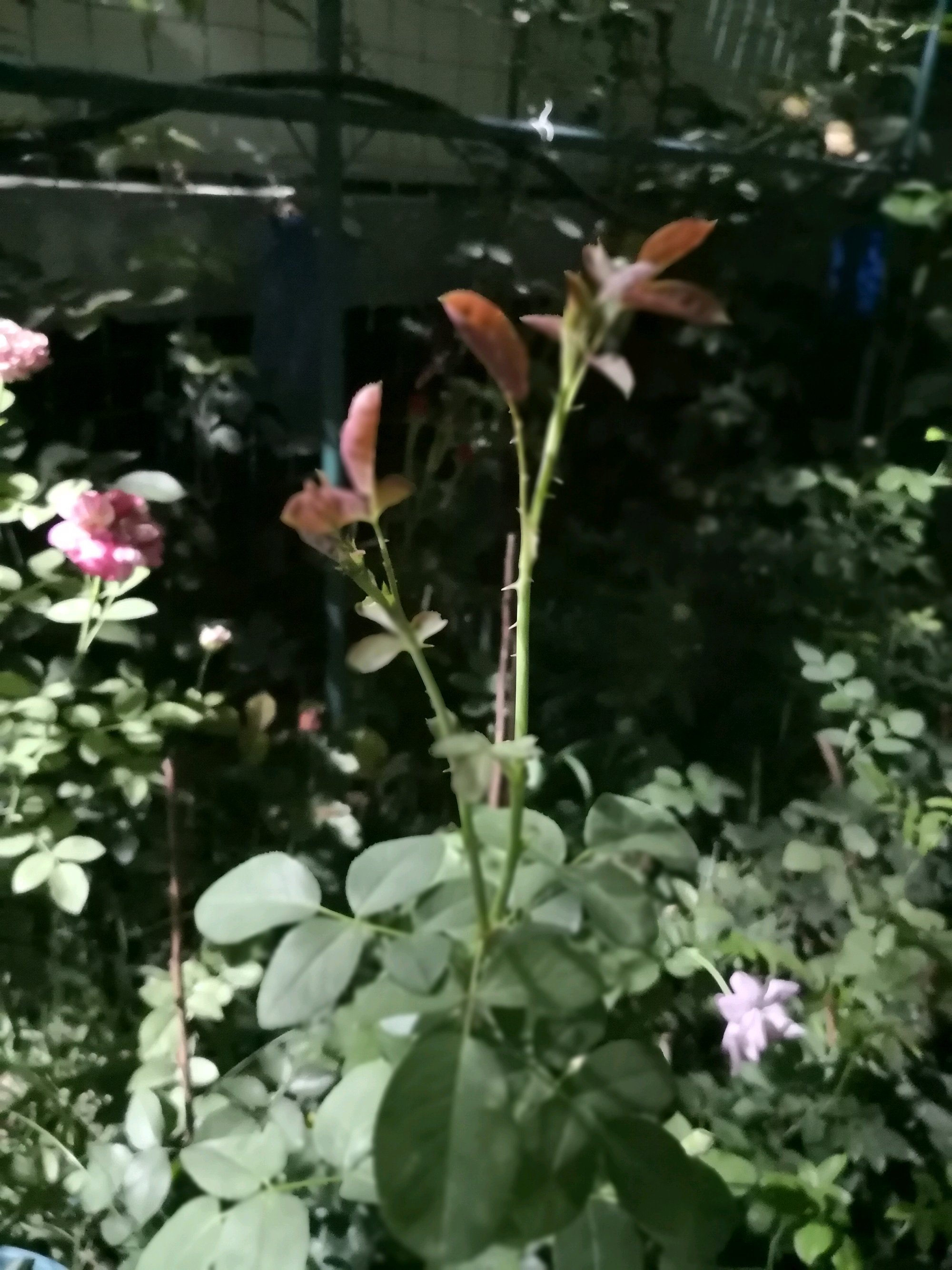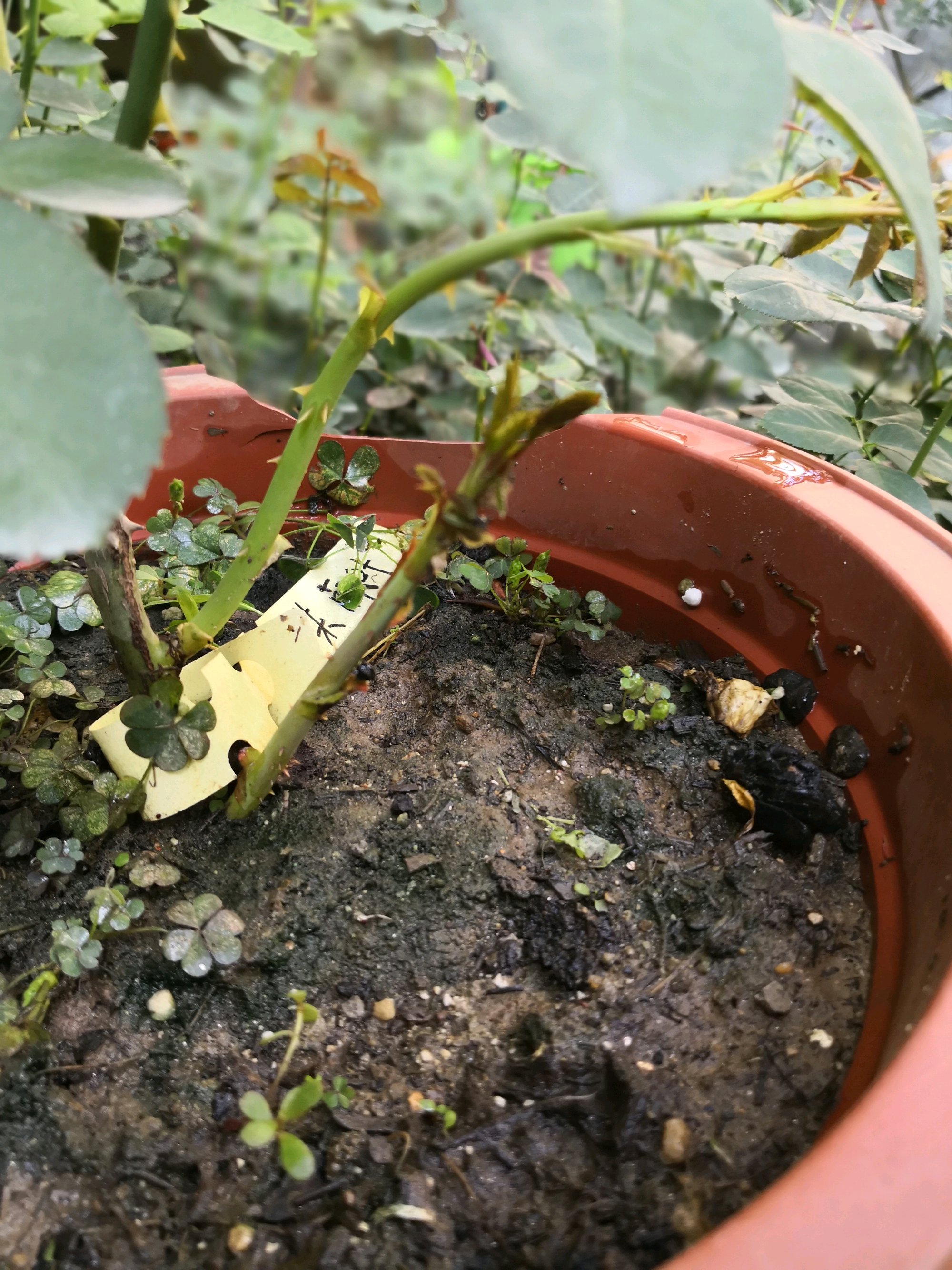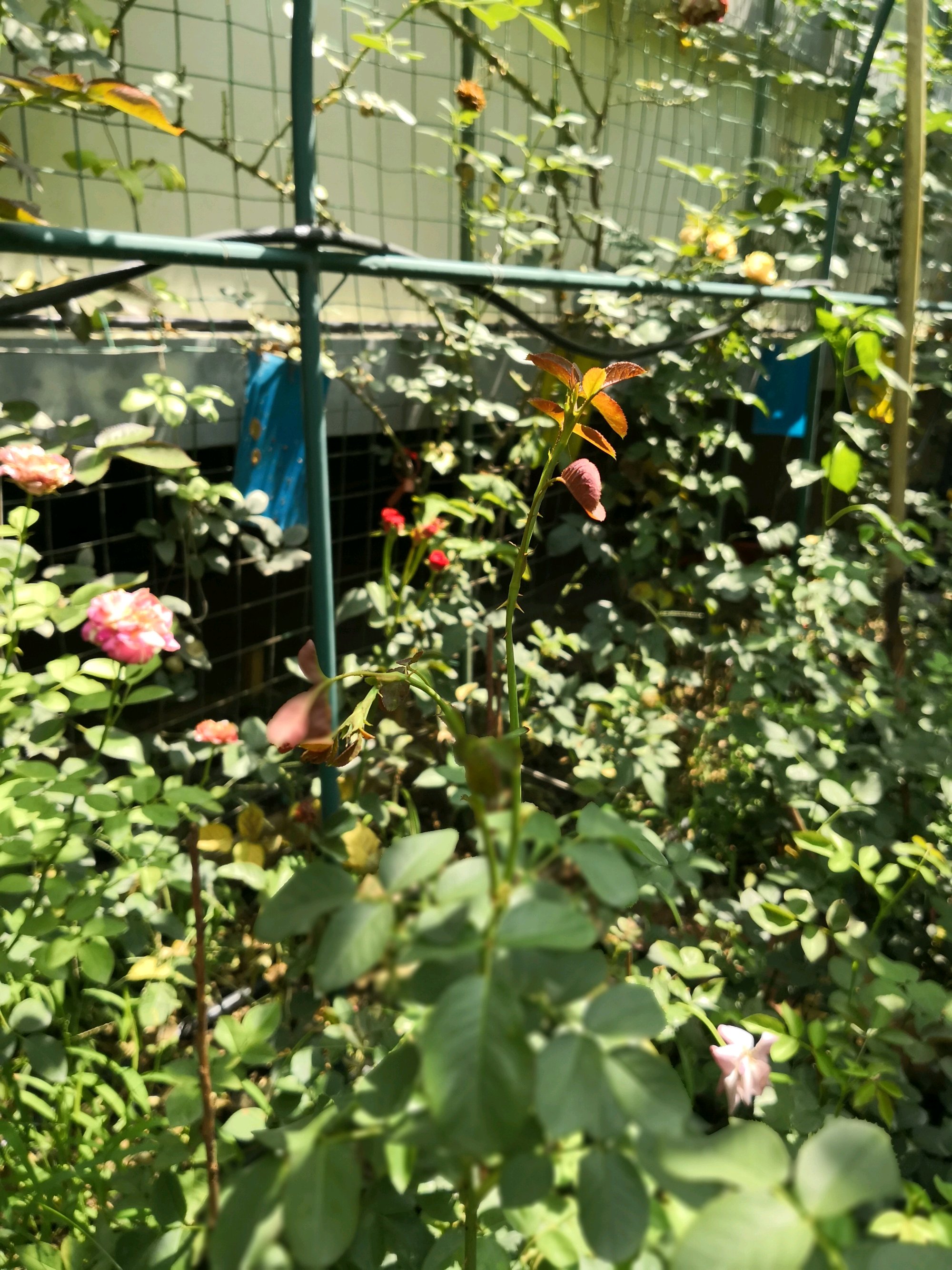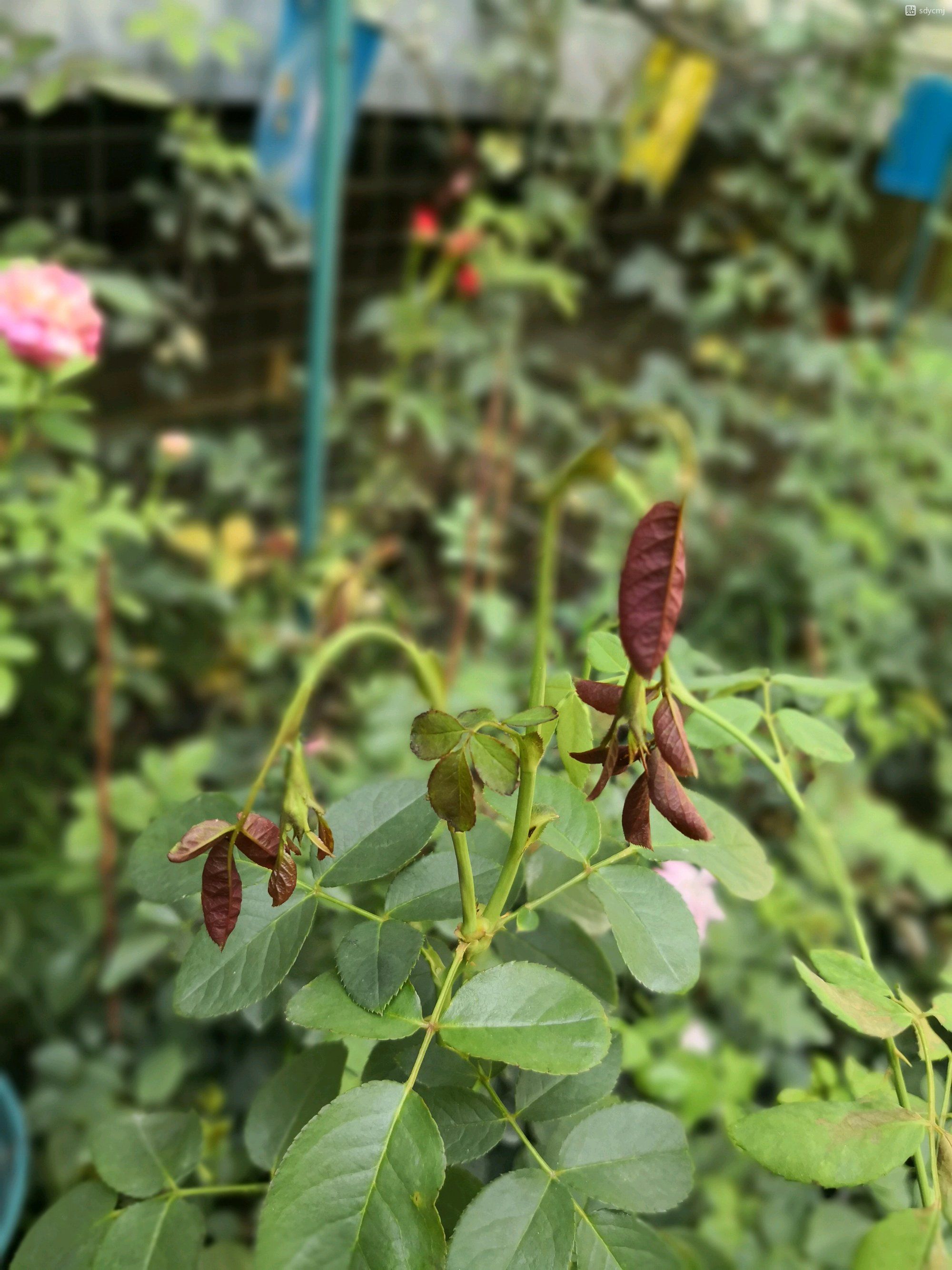 基本上可以确定是肥伤了,前几天看天气预报有大雨,就想着趁下雨给地栽的那些月季撒了点复合肥,然后又顺手给西墙那十几棵盆栽的每盆