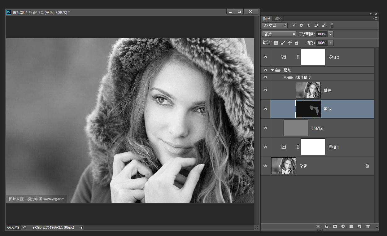 黑色层为画笔涂抹层,初始色为黑色。其与原始图像的差作为控制变量。加在0.5的灰色上再合组设为叠加组模式。因为用的是加,所以原图是变亮的。所以用反相再反相令其还原。