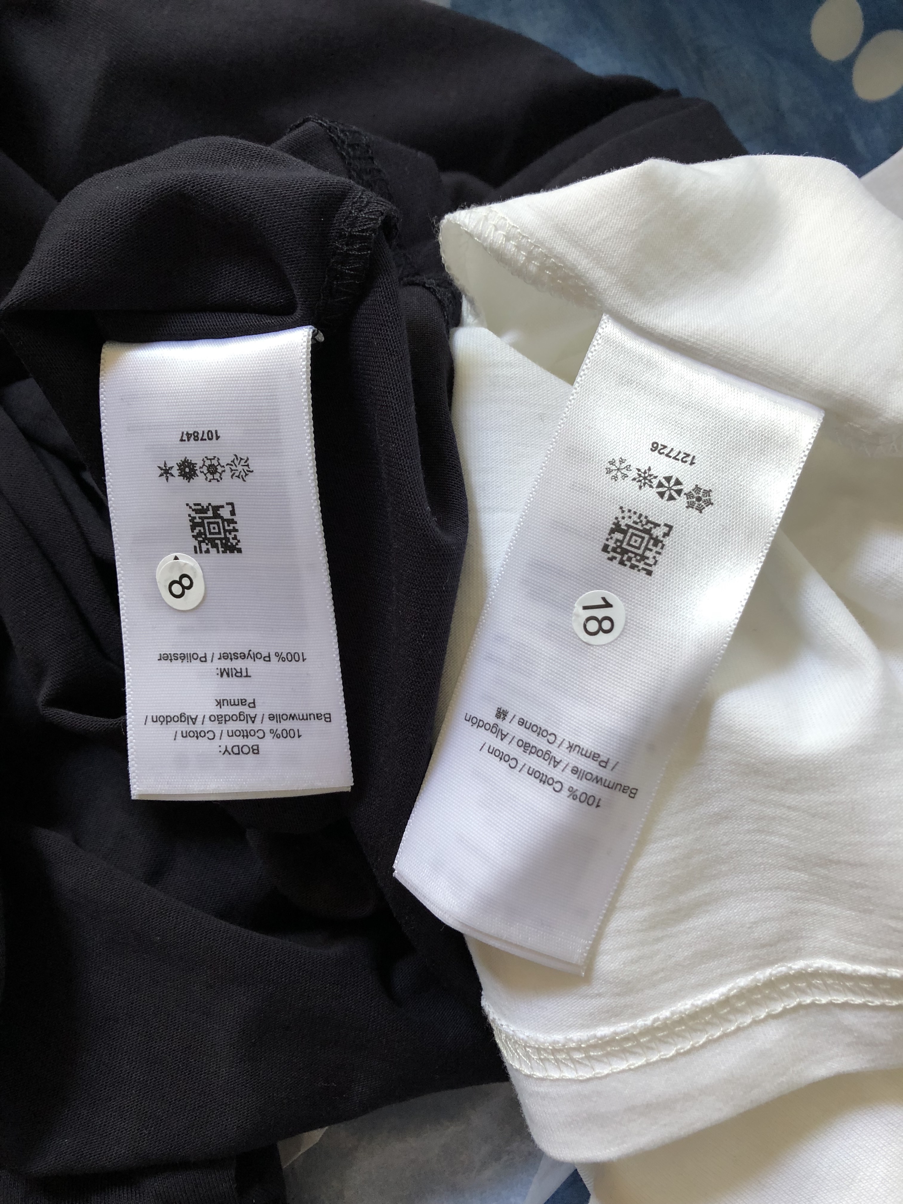 某猫买的,但是两个颜色洗标和吊牌都不一样,而且蓝色那件吊牌和洗标货号对不上,洗标是107547,吊牌是107580,有点担心是假货