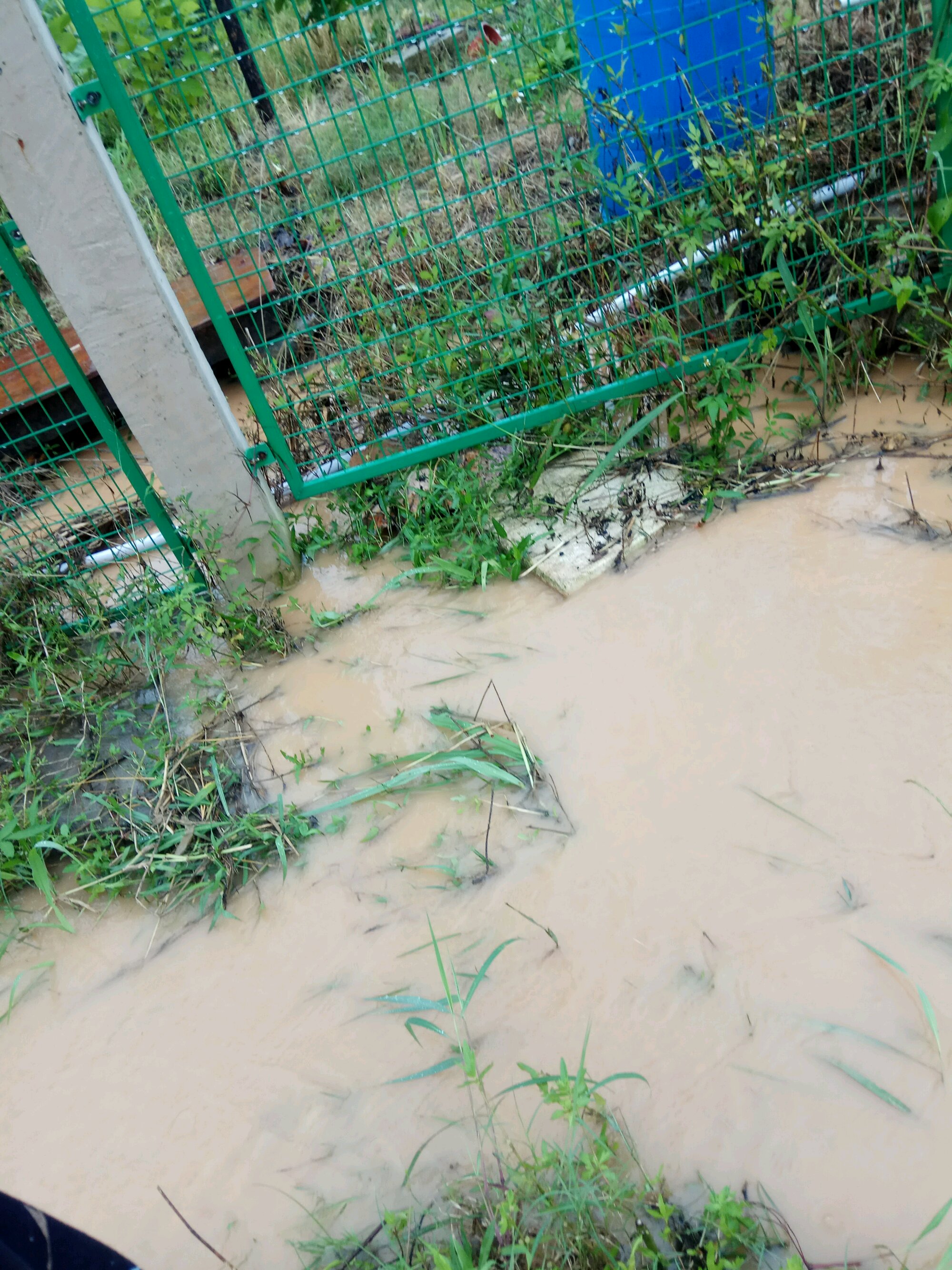 7月7日,下暴雨!冒雨把水沟挑通,一身水,大水全往水泥路上冲,好在有稻草挡一下,不然沙会冲跑好多!
