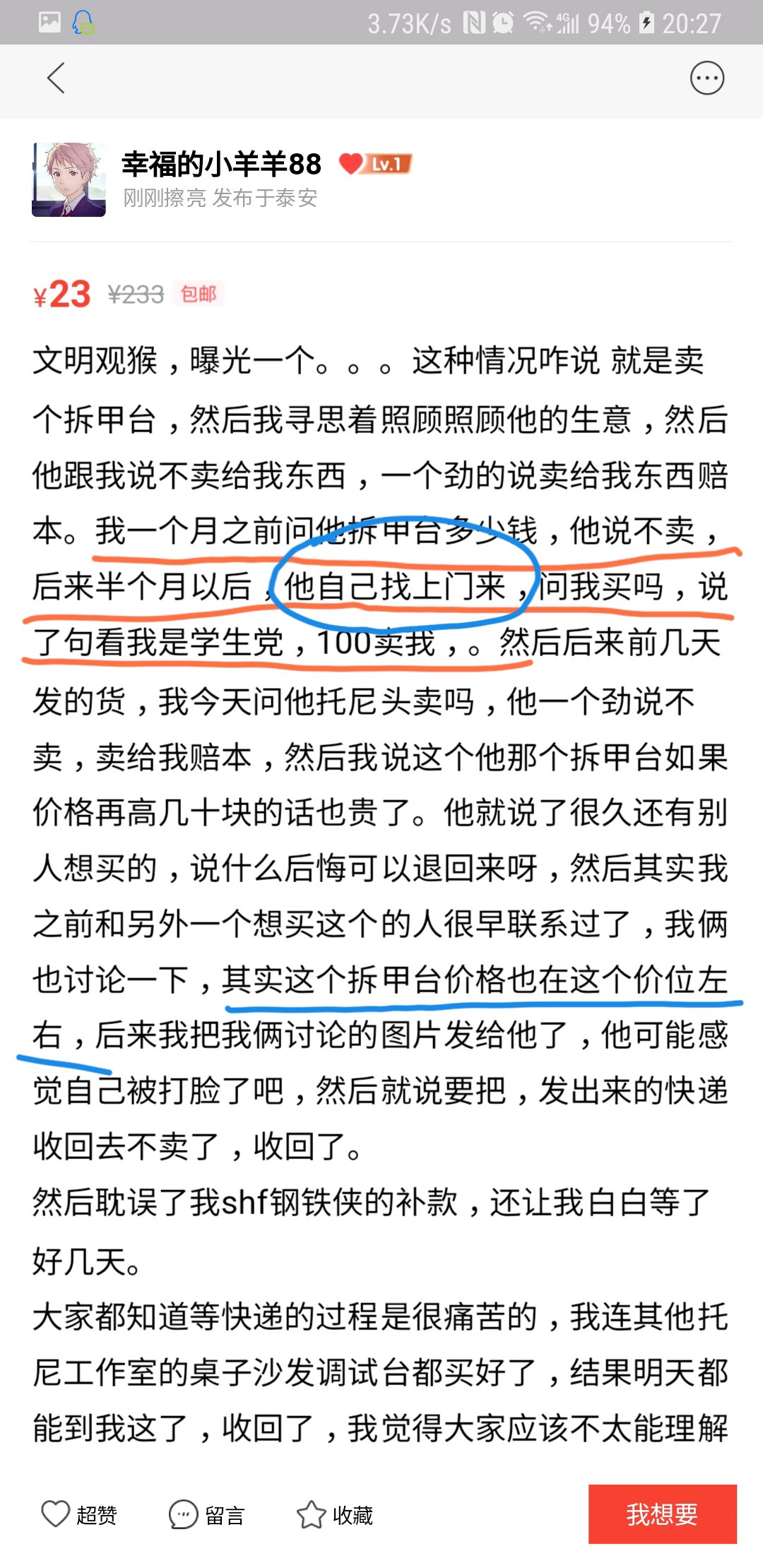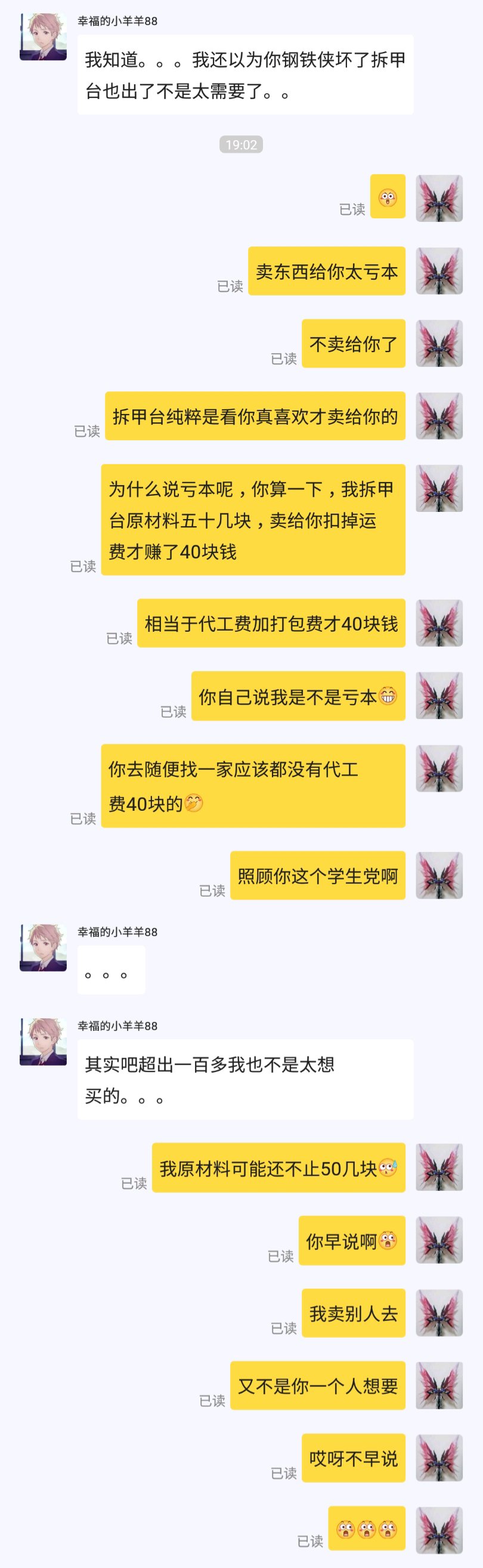 年初有个学生党买家看上我的拆甲台,问我卖不,当时没想卖也没想代工,就回绝了。后面过了差不多半年,我想卖了他又来找我,开个友情价出来,我嫌低也是不想卖的,后面知道他是个学生党,就答应105包邮卖给他了。