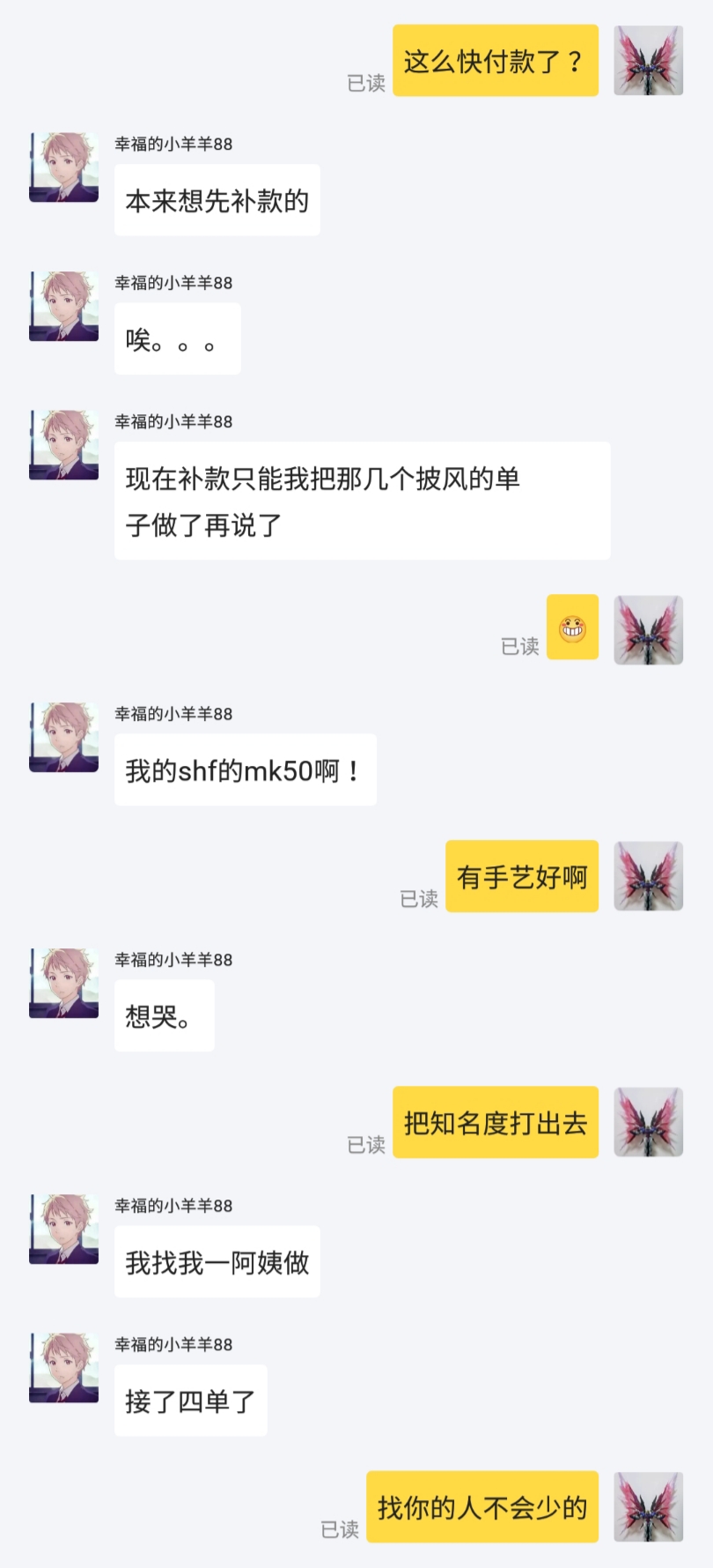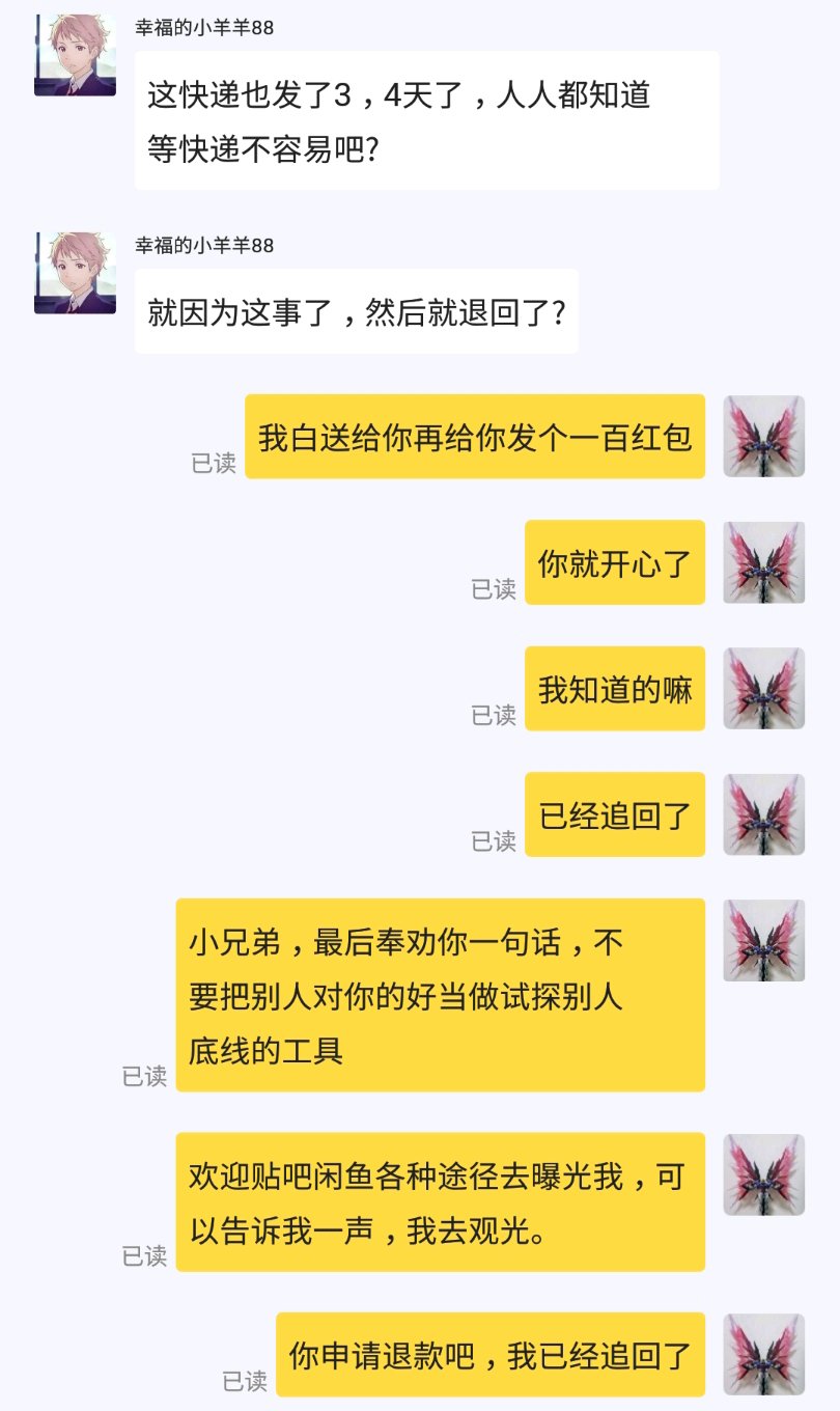 最后我实在火大,追回了快递,自己承担来回运费。这孩子开始说我恶心,然后拉黑了我。究竟是谁恶心呢,这世道啊。