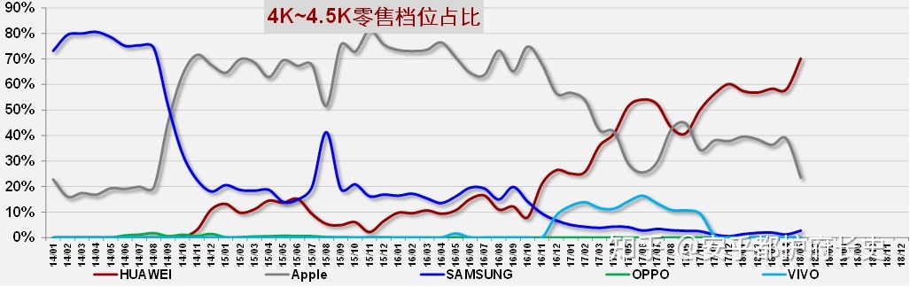 4K-4.5K零售档位:华为P20上市份额上涨到超70%左右,Apple份额回落到近20%,其他厂家观战。
