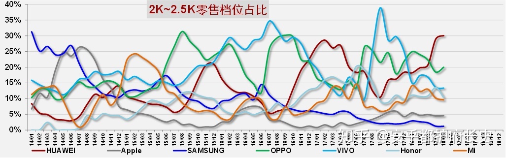 3K-3.5K零售档位:OPPO、VIVO、华为三国大战,其他厂家观战。VIVO增势非常明显,华为份额下跌很快,持续腰部塌陷。