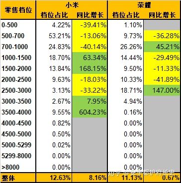 1500以下档位的销量占比仍然持续快速萎缩,对以此档位为销量重点的小米来说,是个极其危险的信号(小米销量中此档位占比69.27%,而荣耀则仅为53.2%)。