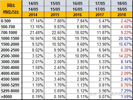 <1K档位销量下降,1K~2K档位增涨明显,整体格局有所优化,抗风险能力有所提升;受Mix2s上市影响,3.5K~5K档位增涨较大,但绝对数量太小。