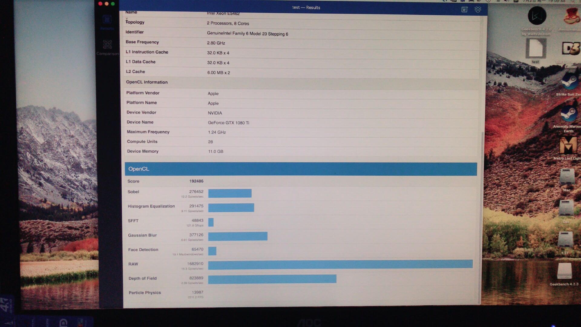 刚刚试跑了一下分 Mac Pro (Early 2008) OpenCL Score 192486 Geekbench 4.2.0 for Mac OS X x86 (64-bit) Result Information Upload Date July 02 2018 11:05 AM Views 1 System Information System Information Operating System macOS 10.13.5 (Build 17F77) Model Mac Pro (Early 2008) Motherboard Apple Inc. Mac-F42C88C8 Proto1 Memory 32768 MB 667 MHz DDR2 FB-DIMM Northbridge Southbridge BIOS Apple Inc. MP31.88Z.006C.B05.0802291410 Processor Information Name Intel Xeon E5462 Topology 2 Processors, 8 Cores Identifier GenuineIntel Family 6 Model 23 Stepping 6 Base Frequency 2.80 GHz Package Codename L1 Instruction Cache 32.0 KB x 4 L1 Data Cache 32.0 KB x 4 L2 Cache 6.00 MB x 2 OpenCL Information Platform Vendor Apple Platform Name Apple Device Vendor NVIDIA Device Name GeForce GTX 1080 Ti Compute Units 28 Maximum Frequency 1.24 GHz Device Memory 11.0 GB OpenCL Performance Score 192486 Sobel 276452 12.2 Gpixels/sec Histogram Equalization 291475 9.11 Gpixels/sec SFFT 48843 121.8 Gflops Gaussian Blur 377126 6.61 Gpixels/sec Face Detection 65470 19.1 Msubwindows/sec RAW 1682910 16.3 Gpixels/sec Depth of Field 823889 2.39 Gpixels/sec Particle Physics 13987 2211.2 FPS