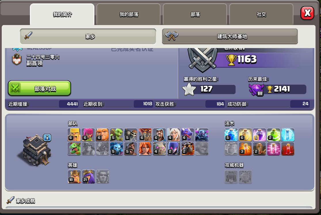 现在九本快满了,兵种科技(现在在升哥布林)除了皮卡,龙宝和女武神基本都满了,部落战主要是石法巫用得多点,准备女王30再升十本。