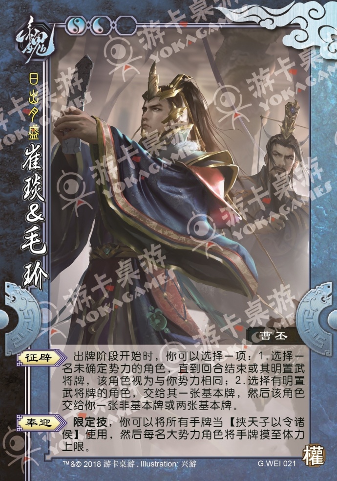 号称刘备重臣的法正,如果不是先于诸葛而去,托孤于谁就不好说了。加入权包之后,蜀国玩家开场都要大喊一句:“还有‘王法’吗?”眩惑、恩怨又是改动后与身份技能重名。