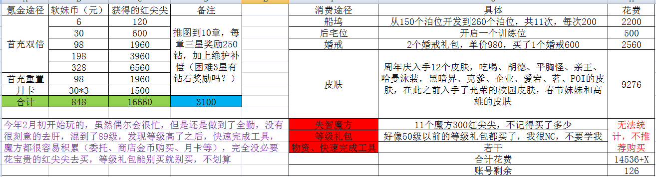 我都不敢正视我花了多少,去年648以下首充,今年全部首充,还好渠道服有7折。。。。