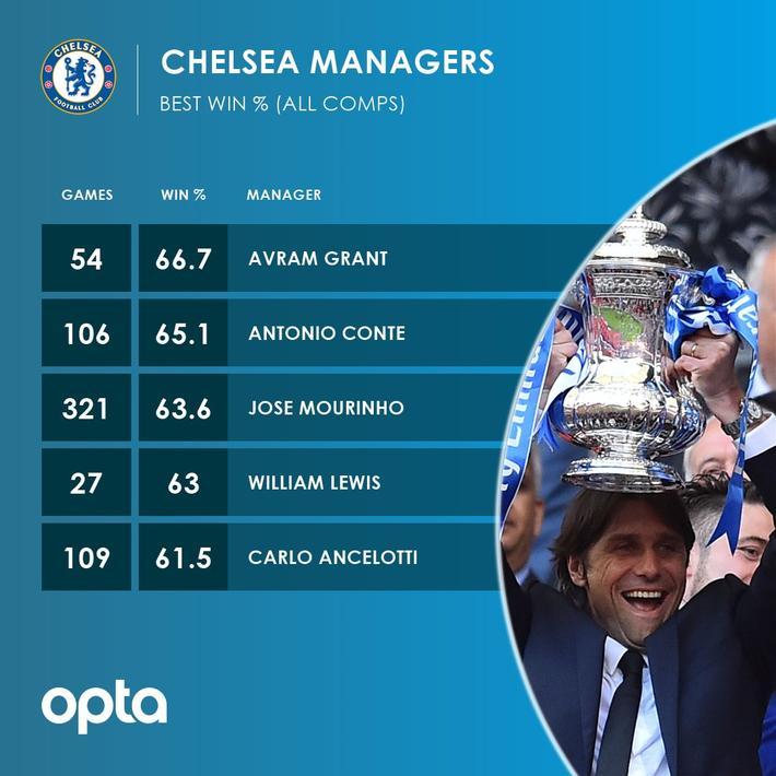 自2016年上任以来,孔蒂带队踢了106场比赛,胜率高达65.1%,仅次于带队踢了54场比赛,胜率为66.7%的格兰特。在带队两年间,孔蒂帮助球队赢得一次英超冠军和一次足总杯冠军。在这份切尔西队史执教胜率排行榜上,穆里尼奥以63.6%排在第三位,威廉-刘易斯63%排在第四位,安切洛蒂61.5%排在第五位。