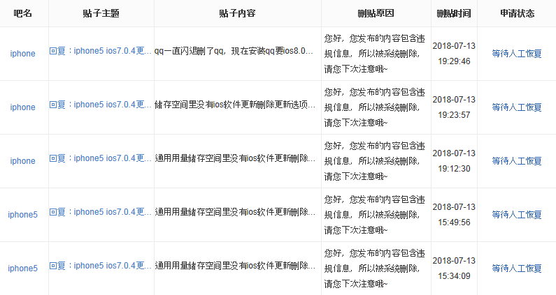 在iphone吧发咨询帖,回复被系统无故删除,