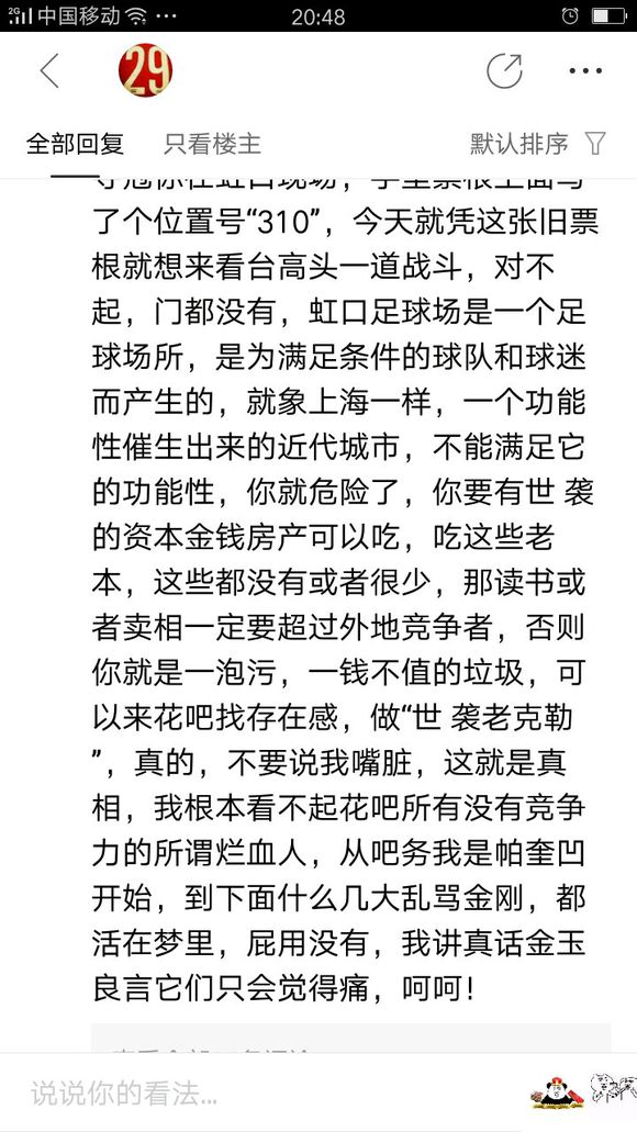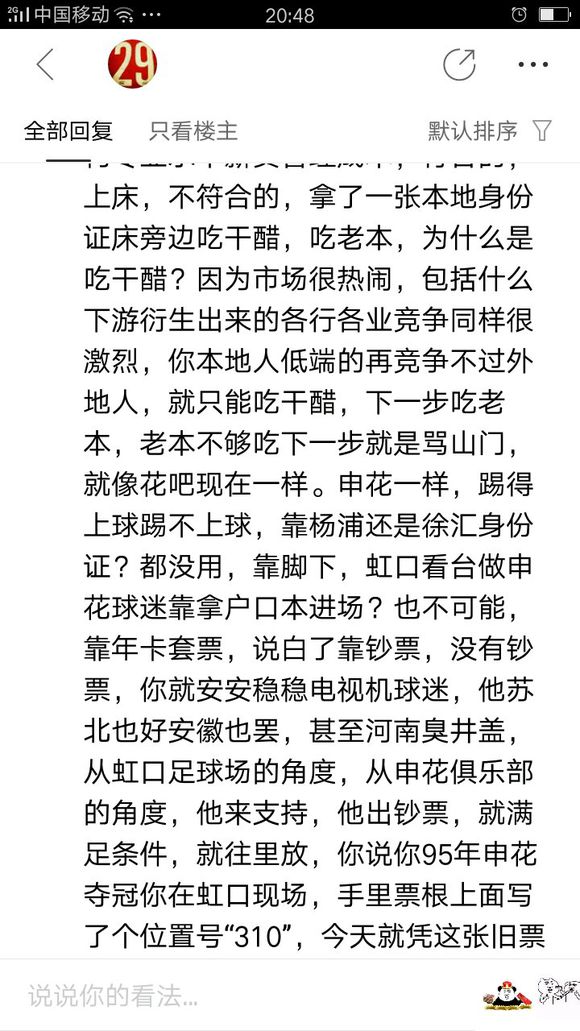 其实我觉得他说的还是有道理的 可以那么理解 这里是申花吧 是我们一个寻找归属感的港湾 肯定立场上倾向保守主义 维护上海人自身 所以不欢迎太客观的话