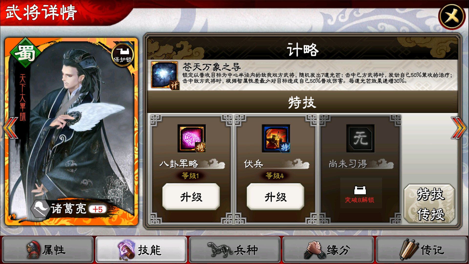 二、技能搭配。由于养成资源较少,测试较少,前期推荐利用诸葛亮的智力上伏兵秒人,或者利用亮哥可攻可奶的特性上天师,治疗队友,再加上亮哥本身的计略可以省一个治疗。