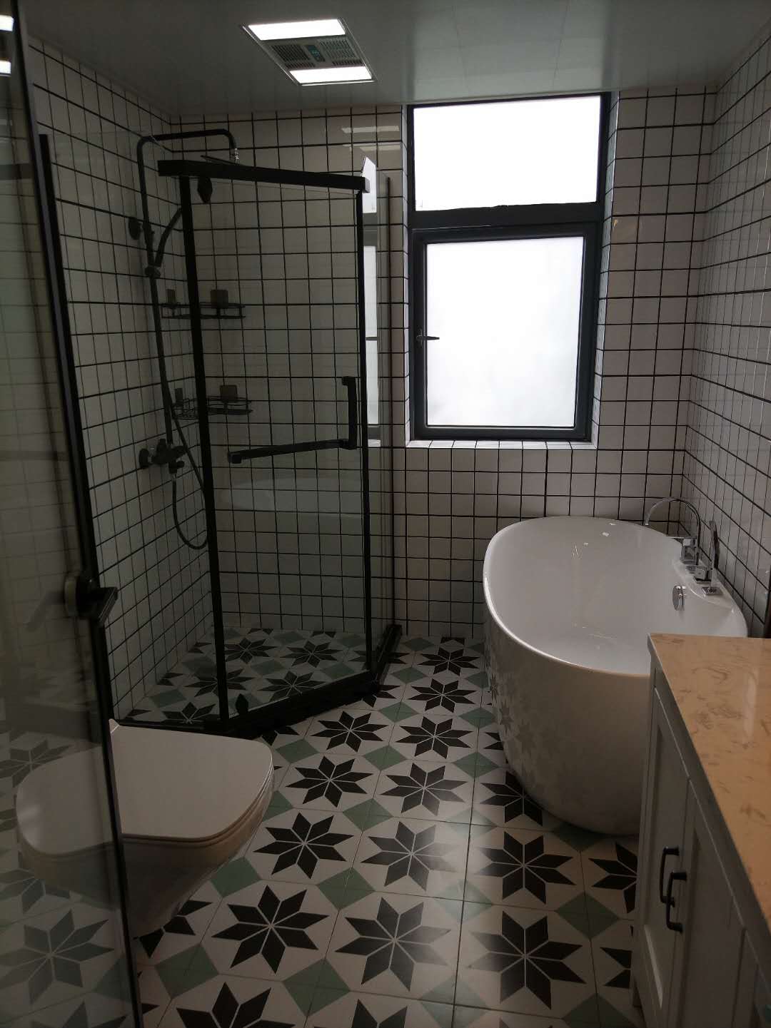 感觉挺有创意的,瓷砖喷成白色,不呆板也不会太跳跃,楼主自己想的办法吗?
