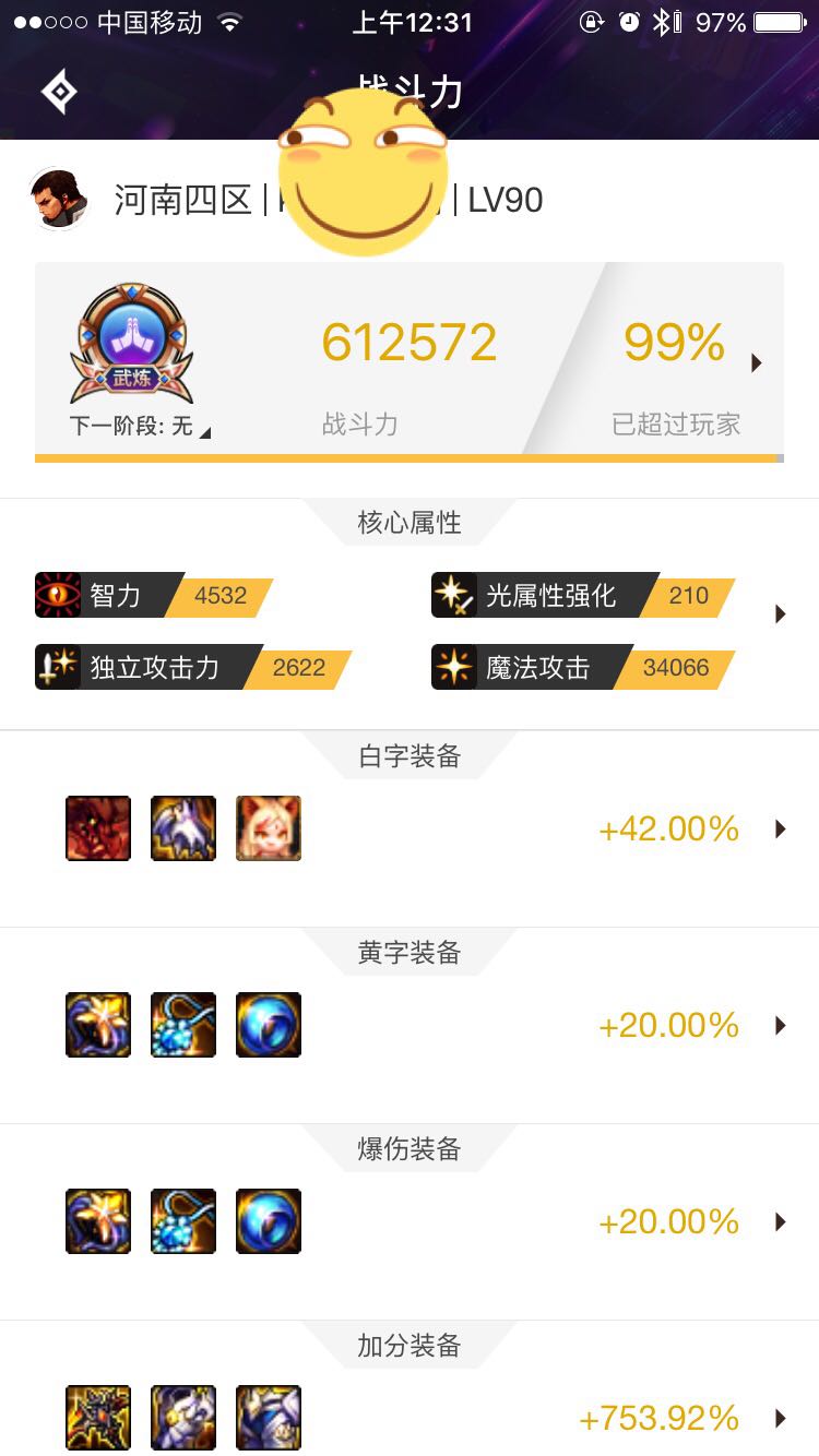 好像是光强210,智力4300多一点,独立2600左右,助手卡装备看不到,换装就差一个徽章,宝珠齐全