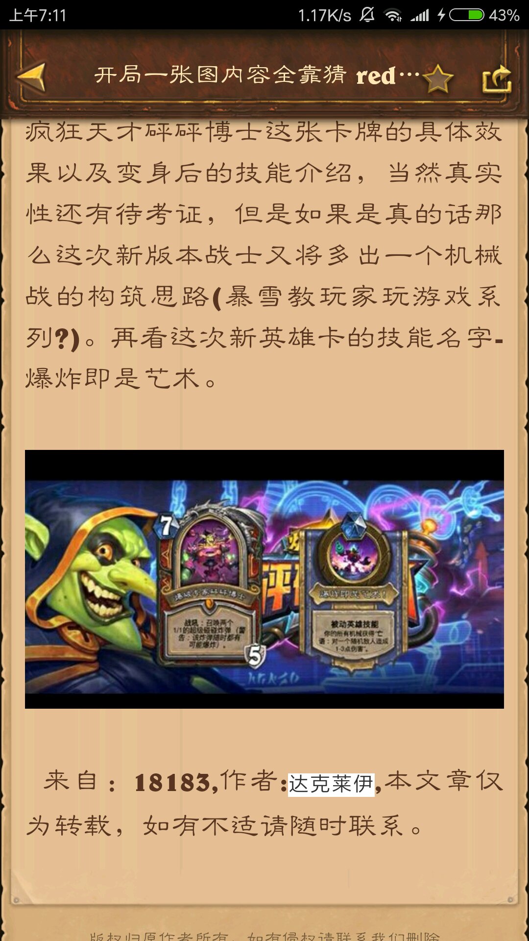 之前曾有玩家曝光出战士新英雄卡疯狂天才砰砰博士这张卡牌的具体效果以及变身后的技能介绍,当然真实性还有待考证,但是如果是真的话那么这次新版本战士又将多出一个机械战的构筑思路(暴雪教玩家玩游戏系列?)。再看这次新英雄卡的技能名字-爆炸即是艺术。