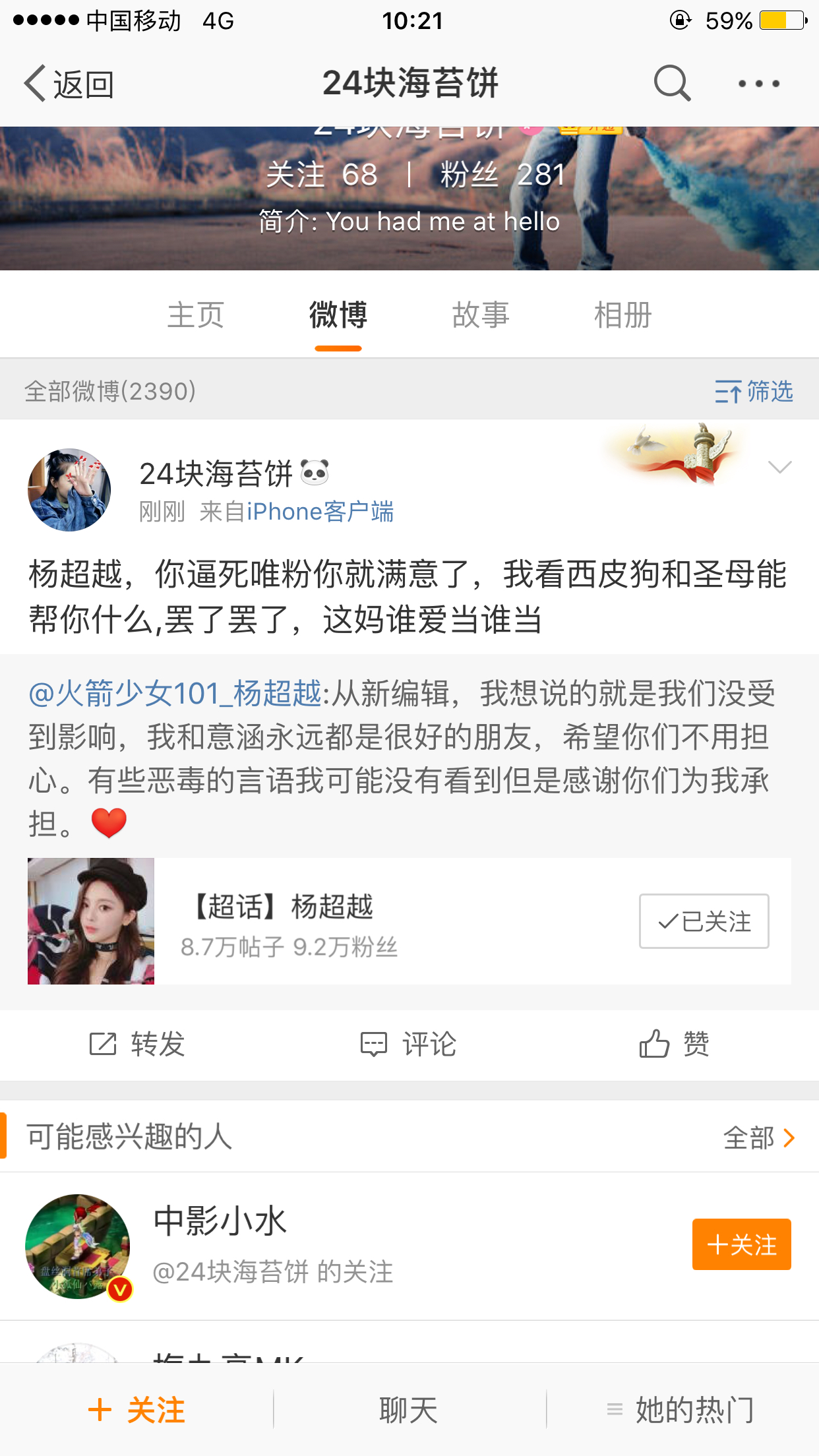 回复 💥💥岐路💥💥💨 :还是觉得,粉互撕就算了,谁都是为了护主,可是还是有人带节奏连正主也黑了,我家人语那么佛,居然也有人黑,很气愤的