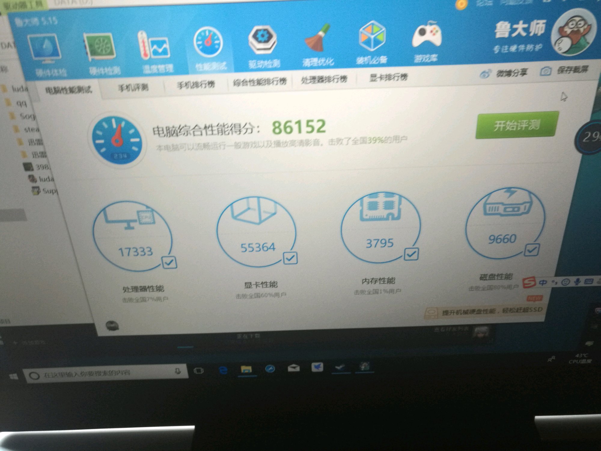显卡开了,不然哪来那么高的显卡分。cpu不该这点分