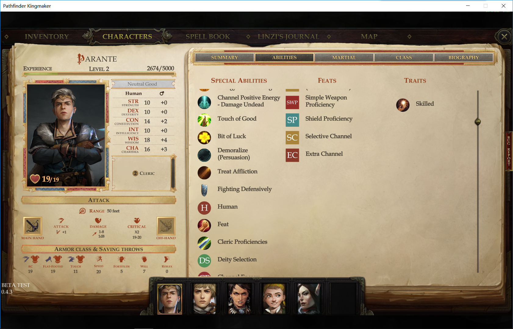 注意下面我的队友,没错我就是要开后宫队。第二个是有圣武士属性的战士(竟然16魅力真是白瞎了),然后是蛮子,诗人(也是你冒险过程的记录人),负能量审判,最后还缺一个半精灵法师,这个要在后面才能拿到。所以本人只能勉为其难的当牧师了。