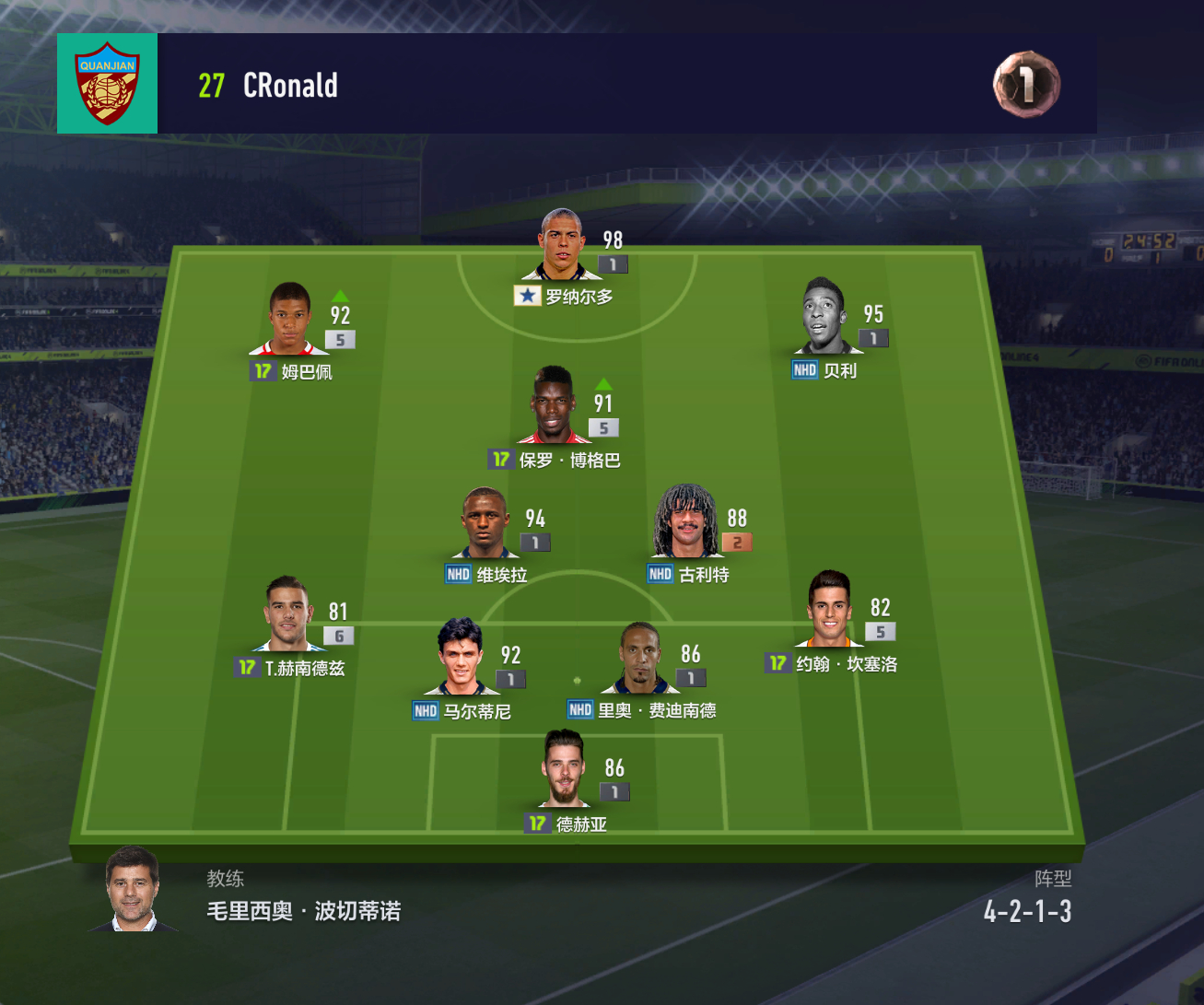 最后决定,队员就用中超名宿,主力如图。这几个银卡都是在挂掉4-5次之后上的,脸太黑,没办法。锋线:权健名宿帕建国,恒大名宿平头哥