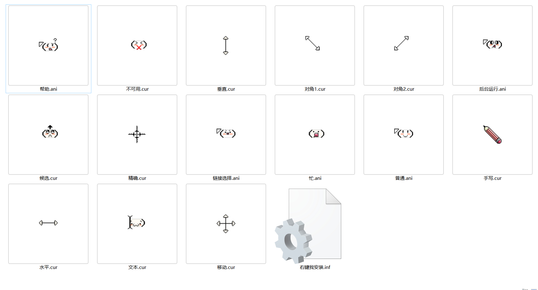 安装方法,文件夹内有一个inf格式的文件,右键安装然后选择指针,点击安装即可。