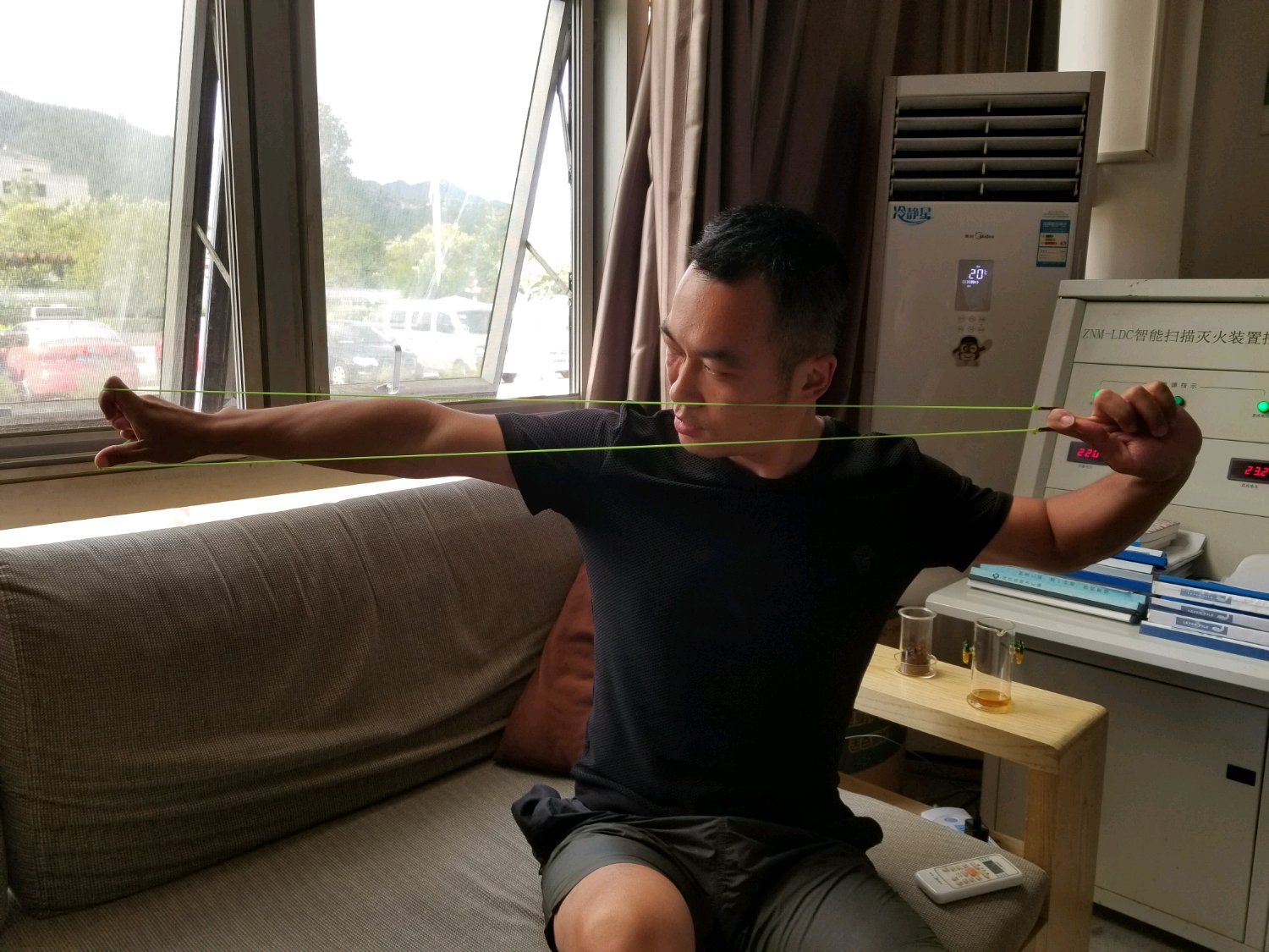 喵点水平偏左或者是水平偏右,假设你是沙发上的弹弓,拉开弓跟一面墙形成四十五度夹角,两个撑头按在墙上,记住姿势