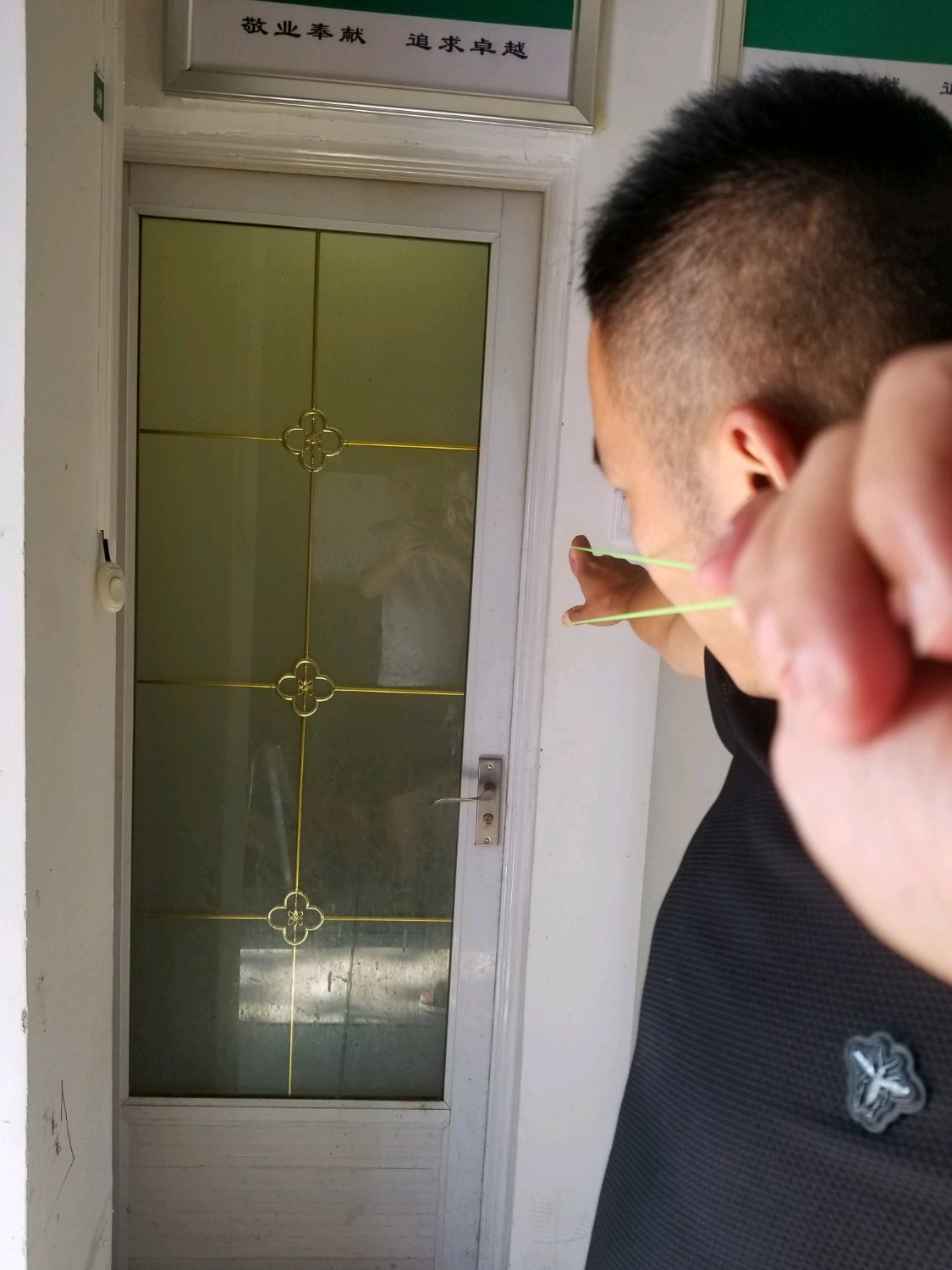 没说完,弓拉开与墙形成45度角,然后两个撑头对着墙按在墙上,然后歪头去看两条皮筋重合,或者不动头就动手腕,新手建议动头