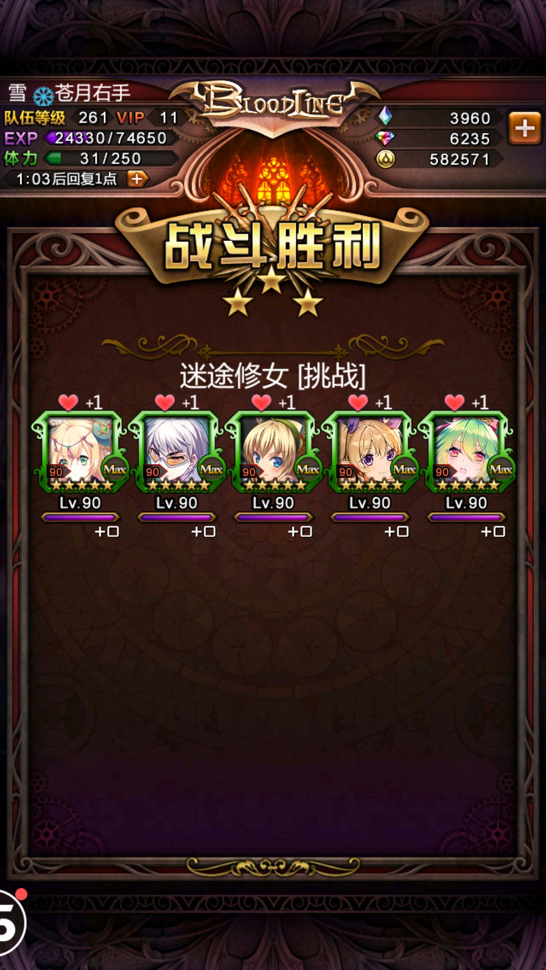 配置如下:依娜队长+辉者+凛+乌龟+春日+好友的芽衣。我是全max配置,至少也要三开战力1w7才够打挑战吧。纯木配置是为了吃木杯和凛的加成,可以换成别的刺客,都能收到芽衣队长技加成。