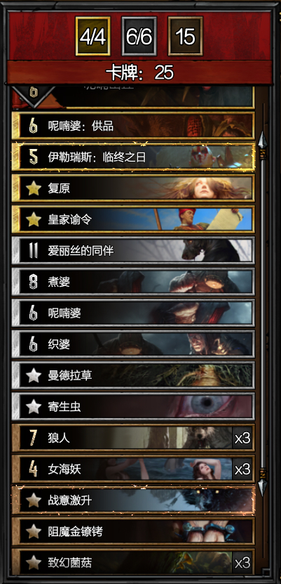 大锤(就是伊乐瑞斯:临终之日这张卡),简单粗暴……算是昆特牌惟一指定快攻卡组了……(因为对面没解牌的话,赢得很快;有解牌的话,也输得很快……)不过总体来说胜率挺高的,低分段完全够用了(不过就是大锤玩家拿不到GG