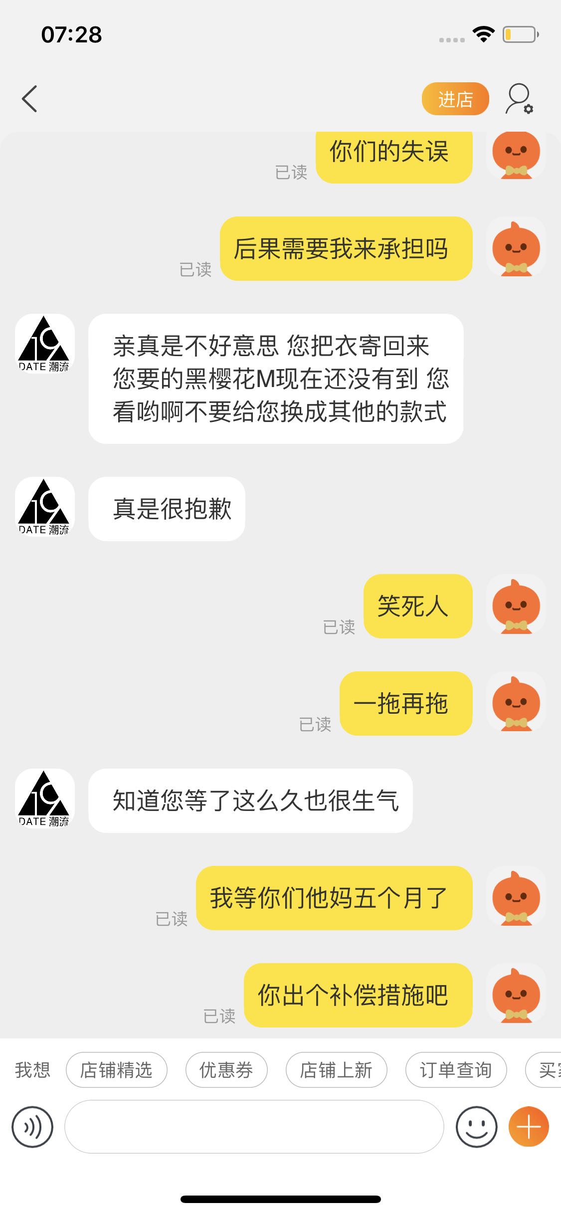 这件黑樱花我不要了,这个店铺非常流氓,一直在口嗨拖货,事后还希望我能理解他们代购的不容易???发这个贴没有别的意思,只是希望吧友们谨慎选择,这家店铺在淘宝做的也是属一属二了,我以前也在他家买过ow,没想到最后这样不欢而散。