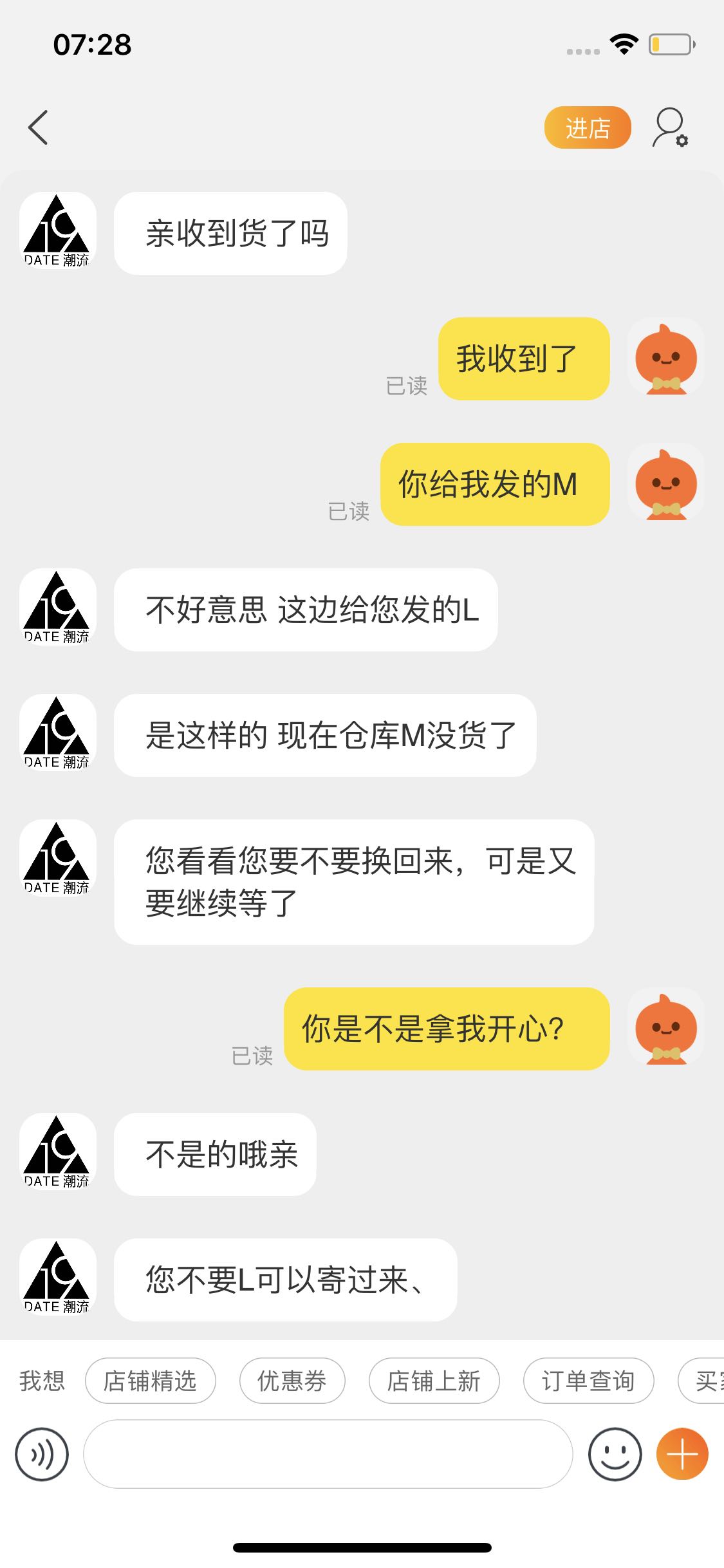 8.1朋友表示收到货,但发的却是L码,我再三提醒卖家发M码,最后给我来这个